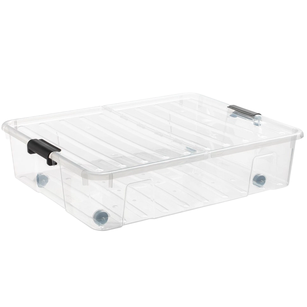 La boîte de rangement 35L à roulettes et à clips est idéale pour optimiser l’espace, notamment sous le lit. Grâce à son format plat et sa grande transparence, elle permet d’identifier facilement son contenu. Équipée de roulettes, elle se déplace sans effort, même pleine. Ses clips de fermeture assurent un maintien sécurisé du couvercle. Empilable, elle offre une solution pratique pour ranger vêtements, chaussures ou linge de maison. Dimensions : 77,5 x 37 x 17 cm. Fabriquée en 100% PP, elle est résistante, légère et durable pour un usage quotidien.