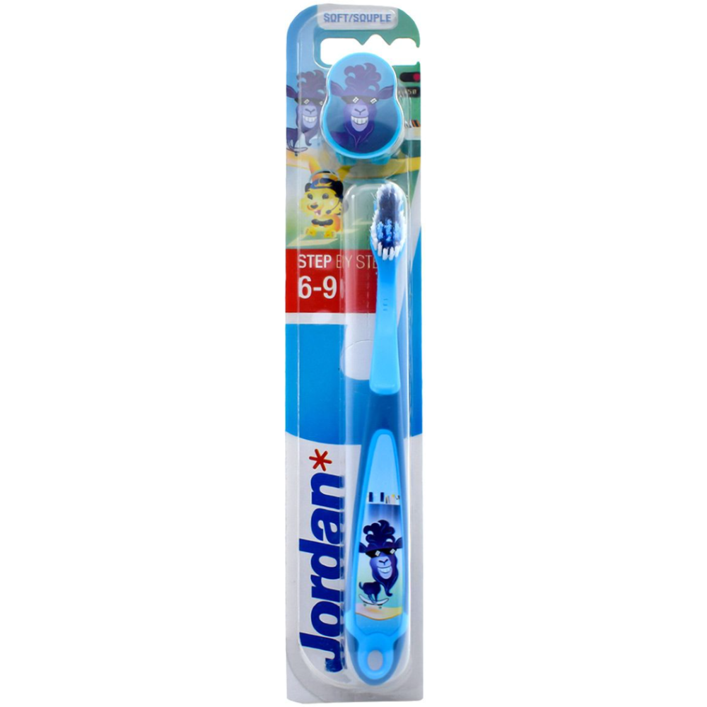 Brosse à dents JORDAN Step by Step dotée de fibres souples de différentes longueurs qui assurent un nettoyage en profondeur de toutes les surfaces - Adaptée pour les enfants de 6 à 9 ans et prend en compte les caractéristiques spécifiques des dents de lait et permanentes délicates - Intègre une tête ronde, ainsi qu'un porte-pinceau et un dessin qui changent de couleur après deux minutes de brossage - Poignée confortable pour les enfants et aussi pour les parents qui leur donnent un coup de main.