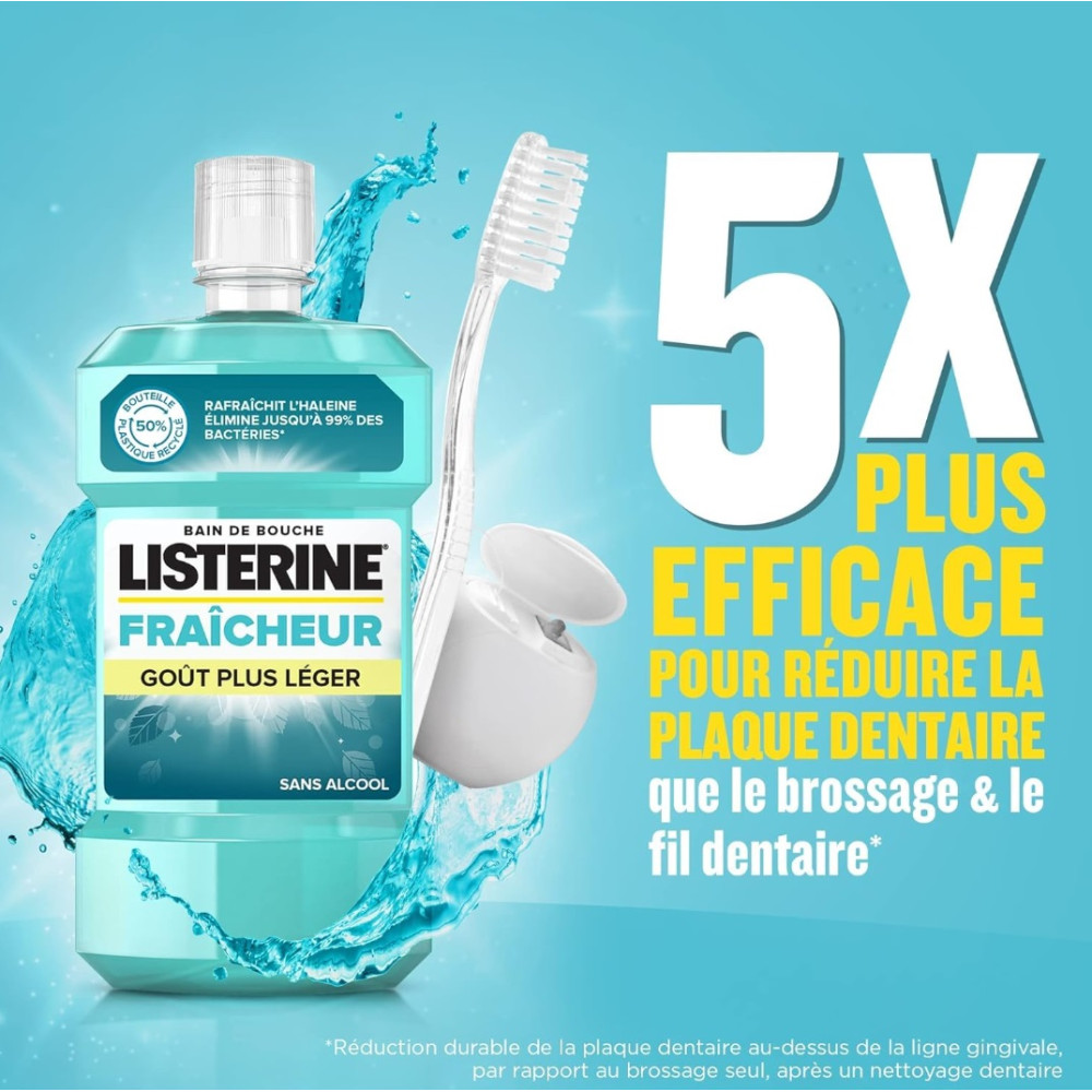 Fraîcheur Intense : Listerine Fraîcheur Intense procure 24h de protection contre la plaque et l'assurance d'une haleine fraîche durable - Il rafraîchit l'haleine, élimine jusqu'à 99% des bactéries - Triple action : Le bain de bouche Listerine combat les bactéries même dans les zones difficiles d'accès, prévient et réduit la plaque et rafraîchit l'haleine.