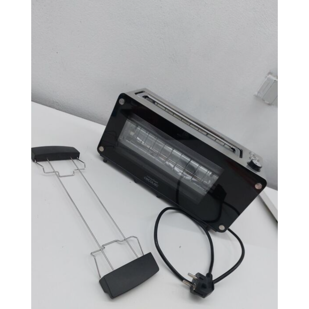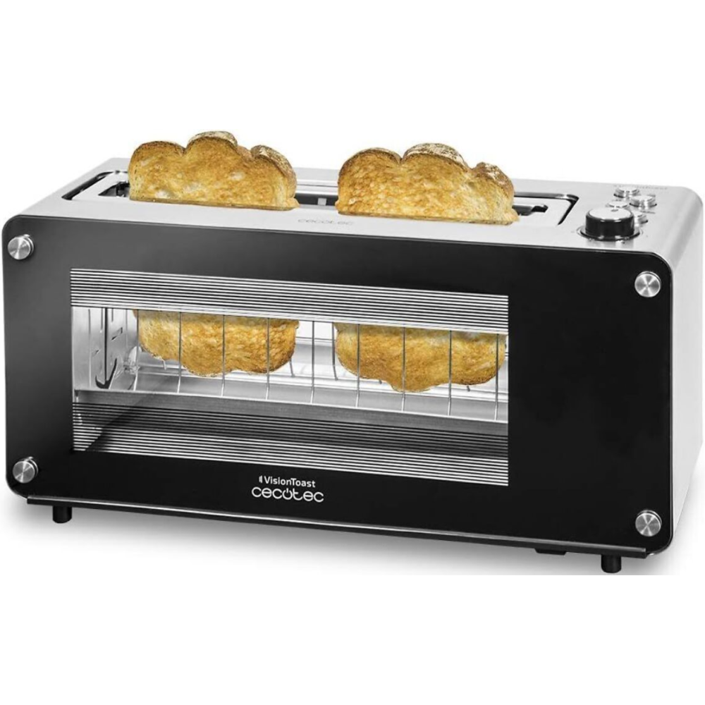 Grille-pain VisionToast Cecotec fabriqué en acier inoxydable avec une fenêtre de contrôle en verre - Affiche une fente XL avec une capacité de 2 tranches de pain - Possède un support pour les pains de petite taille - Fonctionne avec un moteur d'une puissance de 1260 W et offre 7 niveaux de grillage et des fonctions préétablies - Dispose d'un mécanisme de déconnexion et pop-up automatique - Possède un système d'auto-centrage pour griller les deux côtés du pain plus uniformément - Constitué d'un plateau ramasse-miettes, d'une base antidérapante et d'un espace de rangement pour mes câbles - Embarque 3 fonctions préconfigurées et une fonction Bagel pour faire le Toast d'un seul côté.