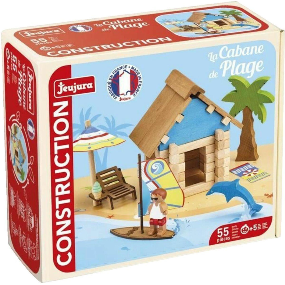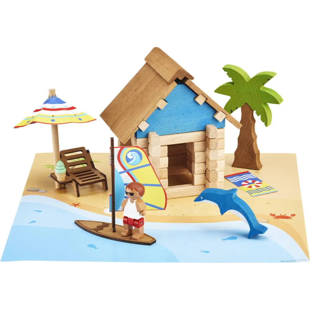 Jeu de construction La cabane de plage composé de 55 pièces à assembler - Fabriqué en bois naturel et teinté pour représenter de manière réaliste une cabane au bord de la plage - Recommandé pour divertir et stimuler la réflexion et la motricité des enfants âgés de 5 ans ou plus - Fourni dans un colis incluant un tapis de jeu, de nombreuses accessoires et une notice de montage - Conditionné dans un contenant en carton mesurant 8 cm de long, 22 cm de large et 18 cm de haut pour un poids de 600 grammes - Favorise une imagination sans limite pour l’enfant qui peut se créer un univers et jouer avec la planche à voile, le dauphin ou faire la sieste sur le transat en bois à l’ombre du parasol ou du palmier.