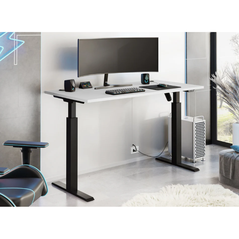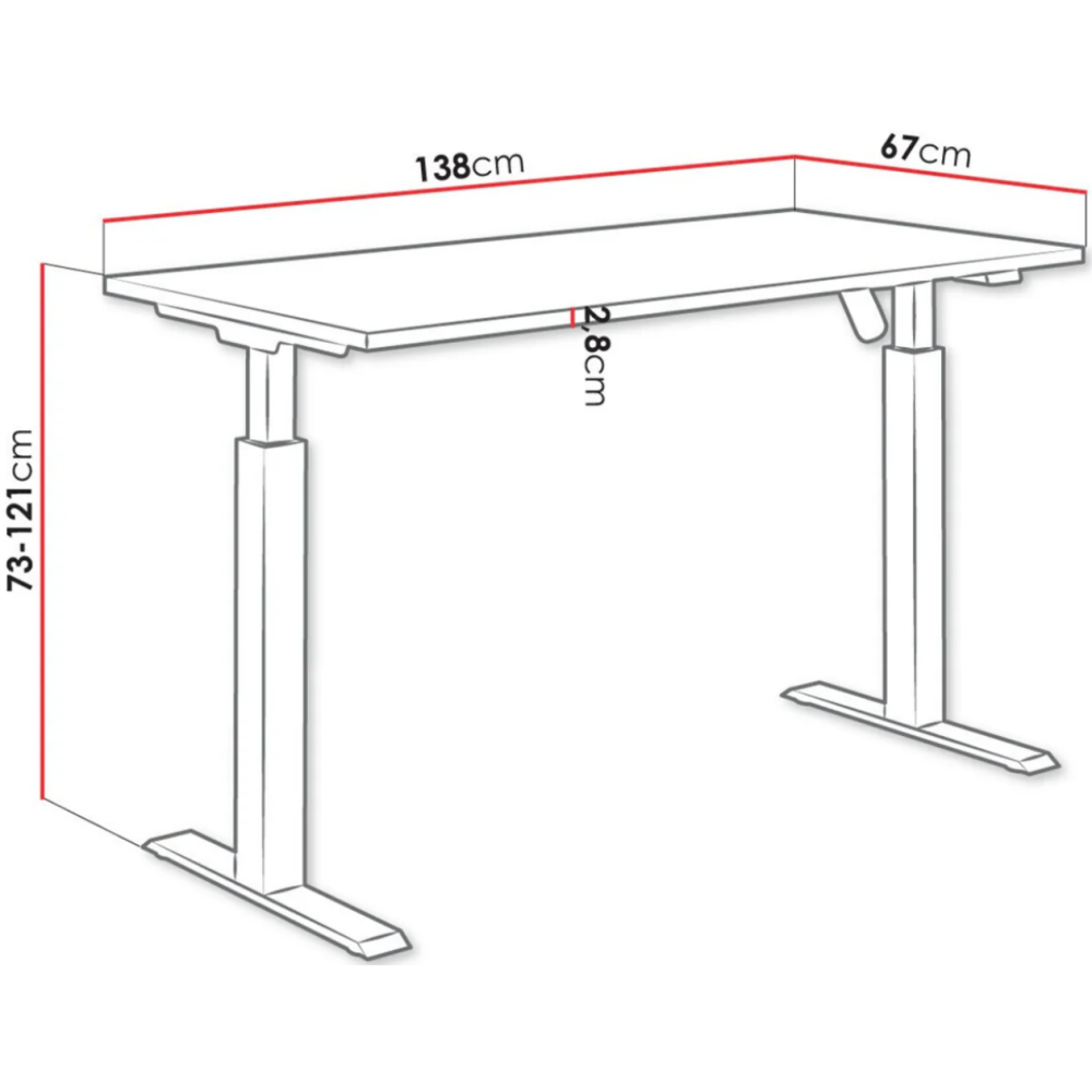 Bureau réglable en hauteur électrique - Dimensions : Largeur: 138 cm - Hauteur: 73 cm - Profondeur: 67 cm - Hauteur maximale: 121 cm - Origine: Union européenne - Poids: 34.3 kg - Matière principale: Stratifié - Matière principale: Métal - Type de table de travail: Réglable en hauteur - Type de table de travail: Électrique - L'épaisseur du plan de travail: 0.28 cm - La tension: 100-240V - Autre(s) matière(s): ABS - Couleur: Noir mat - Couleur: Gris clair.