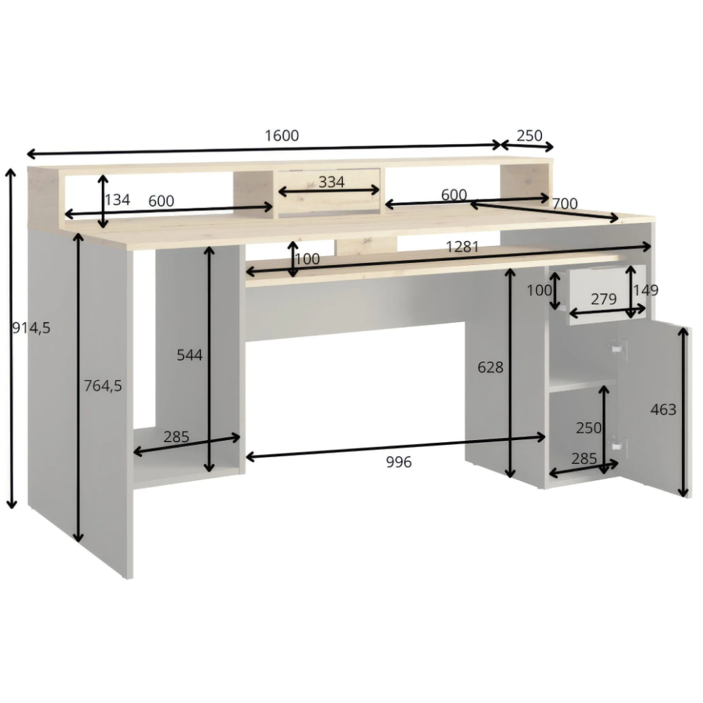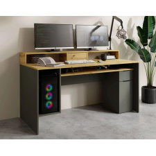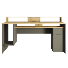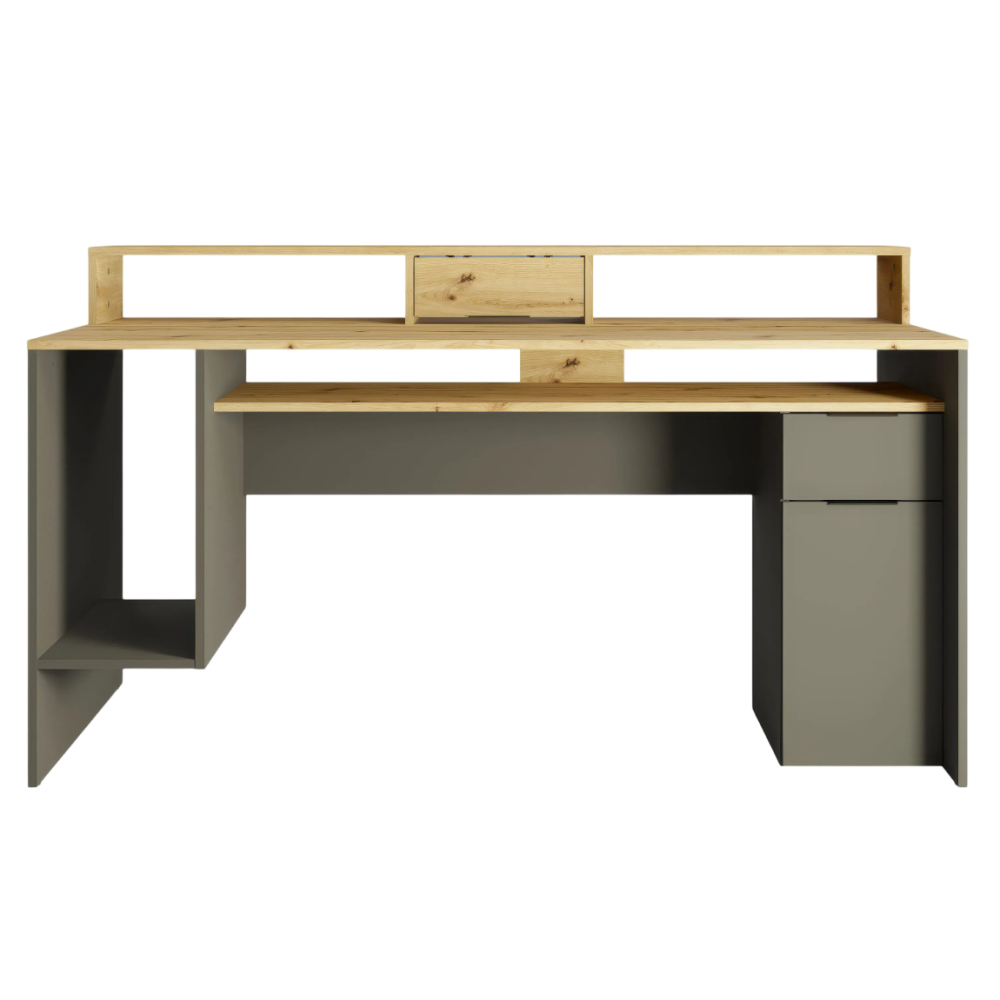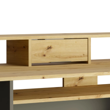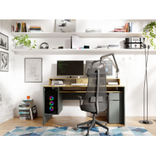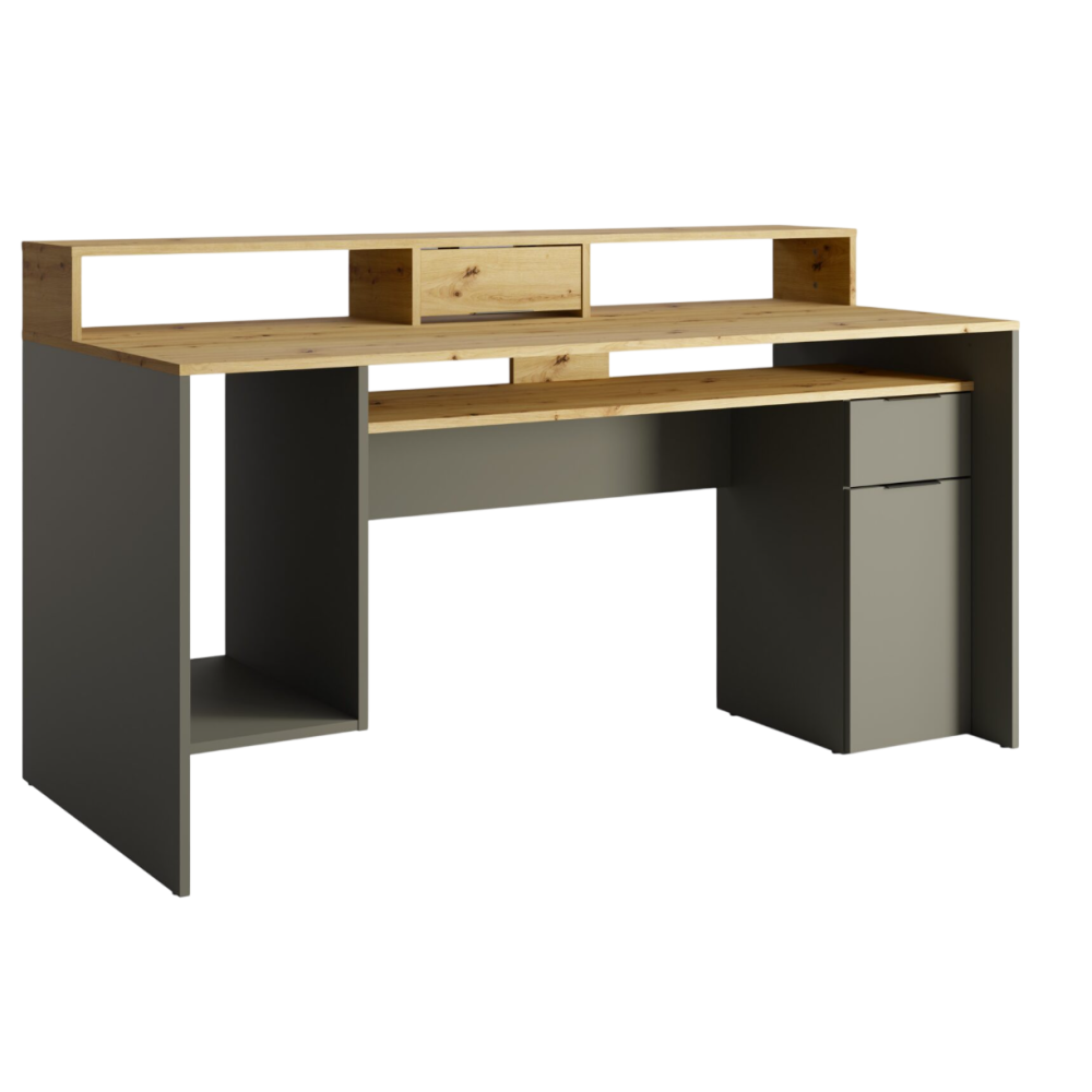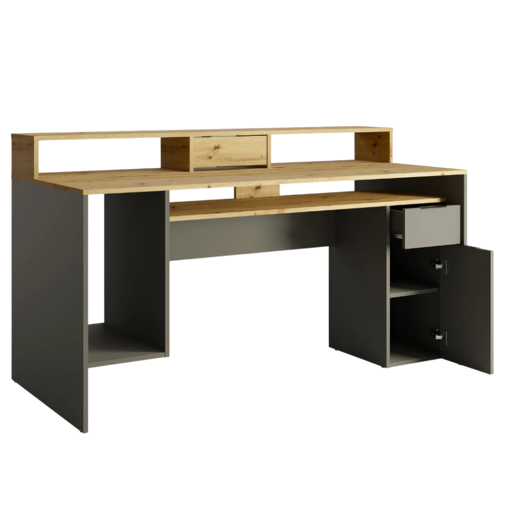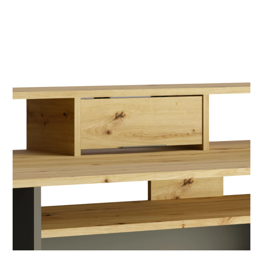 Le bureau REX allie esthétique moderne et grande fonctionnalité pour créer un espace de travail organisé. Avec sa finition chêne artisan et gris graphite, il s’intègre facilement dans un intérieur contemporain. Il dispose d’un tiroir, d’une porte, et de sept compartiments ouverts pour un rangement facile de livres, dossiers et fournitures. Son plateau spacieux offre une surface de travail confortable, tandis que la structure robuste assure une bonne stabilité au quotidien. Grâce à sa réhausse de 39 cm, vous bénéficiez d’un espace optimisé pour poser écrans ou décorations. Dimensions : 91 × 160 × 70 cm - Idéal pour télétravail, études ou loisirs créatifs, combinant ergonomie et design pratique.
