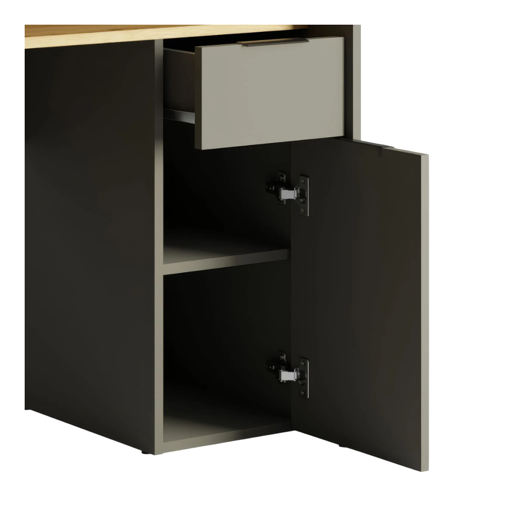 Une solution à la fois pratique et élégante pour un intérieur moderne. Il a également été conçu en pensant aux jeunes. Devant: panneau stratifié 16 mm - Bordure en ABS - Support en métal noir, longueur 136 mm, entraxe 128 mm - rideaux à fermeture douce - Rail de guidage inférieur à fermeture silencieuse, extension 3/4 QUADRO - Corps: Panneau stratifié de 18 mm - Bordure en ABS - Dessus de table : panneau stratifié 28 mm - Bordure en ABS - Dimensions: Largeur : 138 cm, Hauteur : 75,3 cm, profondeur : 107 cm. Couleur: gris clair.