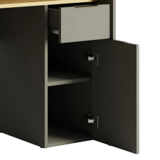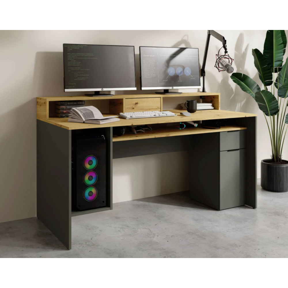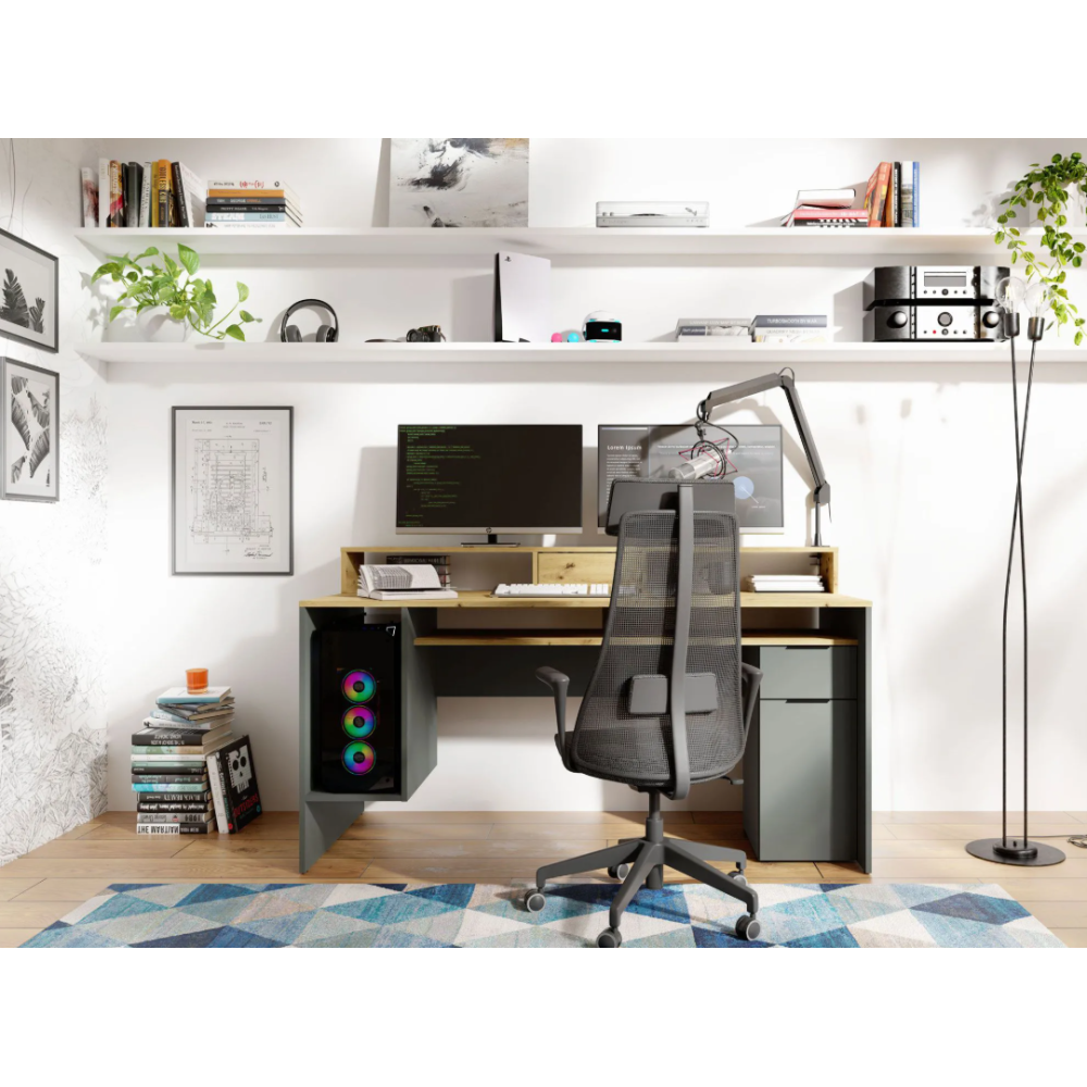 Le bureau REX allie esthétique moderne et grande fonctionnalité pour créer un espace de travail organisé. Avec sa finition chêne artisan et gris graphite, il s’intègre facilement dans un intérieur contemporain. Il dispose d’un tiroir, d’une porte, et de sept compartiments ouverts pour un rangement facile de livres, dossiers et fournitures. Grâce à sa réhausse de 39 cm, vous bénéficiez d’un espace optimisé pour poser écrans ou décorations - Dimensions 91 × 160 × 70 cm - Idéal pour télétravail, études ou loisirs créatifs, combinant ergonomie et design pratique.