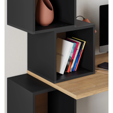Bureau Cubik fabriqué panneau de particules - Coloris silky noir et chêne - Mesure 153 cm de haut, 60 cm d’épaisseur et 143cm de large - Propose une table et des coffres de rangement ouverts en forme de cube procurant à la fois élégance et praticité - Idéal pour faire un coin bureau à domicile ou pour une chambre d’adolescent - Structuré avec un matériau durable et présente des finitions nettes - Intègre des cavités de rangement pouvant accueillir divers bibelots (décoratifs, bureautiques, informatiques, etc).