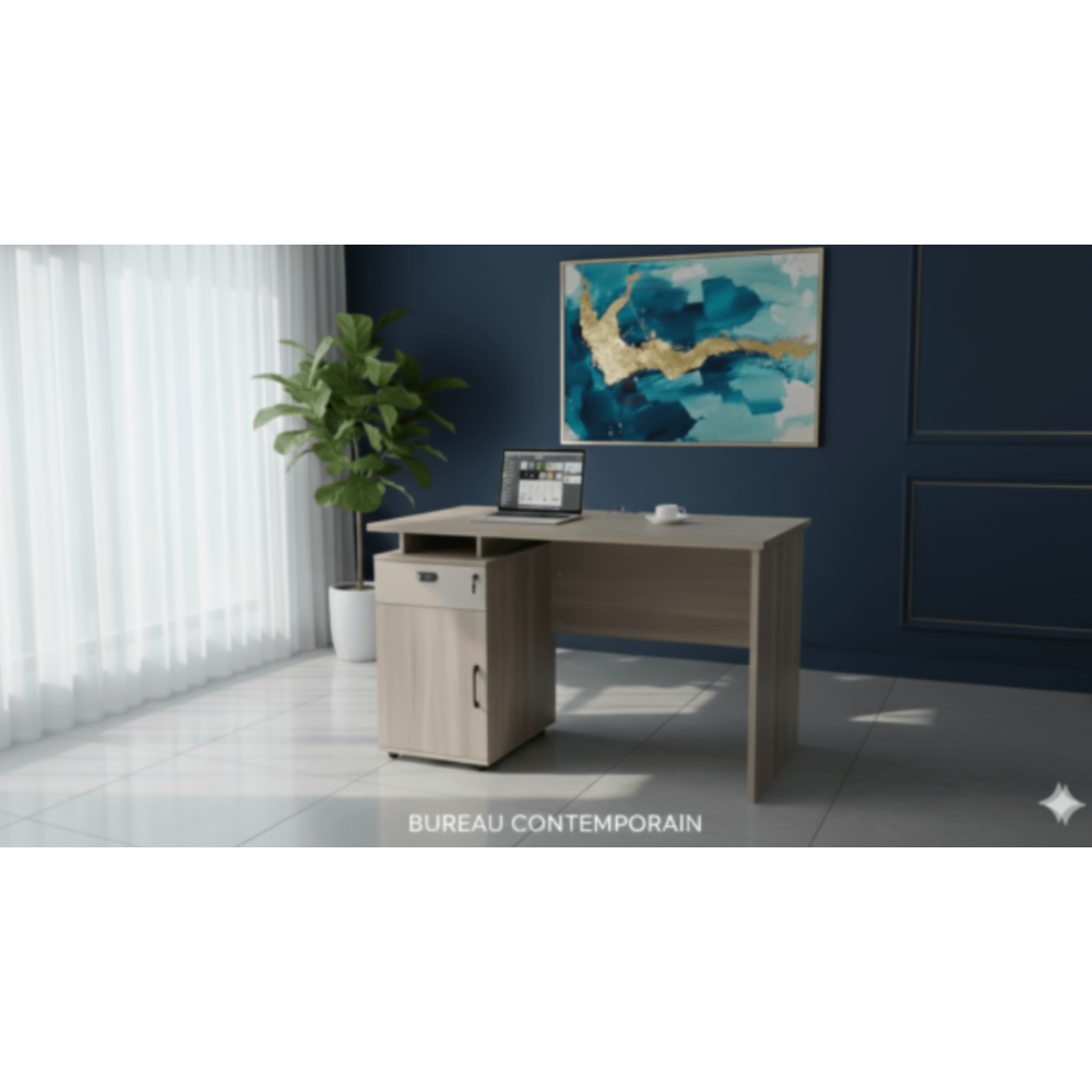 Bureau A842 - Design contemporain allie fonctionnalité et élégance - 3 tiroirs - Sa finition effet bois naturel apporte une touche chaleureuse et s’intègre facilement dans un bureau, une chambre ou un espace de télétravail. Il dispose d’un large plateau idéal pour accueillir ordinateur, documents et accessoires. Sur le côté, un caisson composé de trois tiroirs et d’une niche ouverte offre un rangement pratique pour organiser vos fournitures. Stable et robuste, ce bureau est parfait pour travailler confortablement au quotidien.