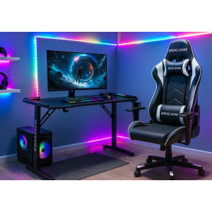 Ce bureau gaming LED T-01 RGB est conçu pour offrir une expérience immersive et un confort optimal. Sa structure en acier noir garantit robustesse et stabilité, tandis que son plateau en panneau de particules mélaminé avec surface antidérapante assure durabilité et maintien des équipements. Avec ses dimensions de 120 x 60 x 75 cm, il offre un espace idéal pour un setup complet. Équipé d’un éclairage RGB USB personnalisable, d’un support casque et d’un porte-gobelet, il allie praticité et style pour un environnement de jeu moderne et organisé.