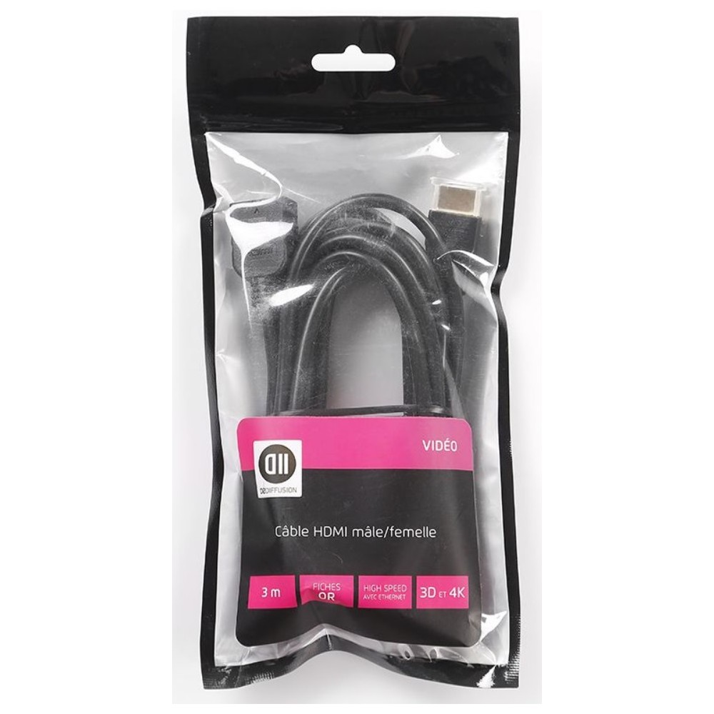Rallonge HDMI mâle/femelle - Connecteurs or - Compatible 4K - AWG 30 - Longueur : 3m - Couleur du câble : noir - Taille du sachet : 11x14cm.