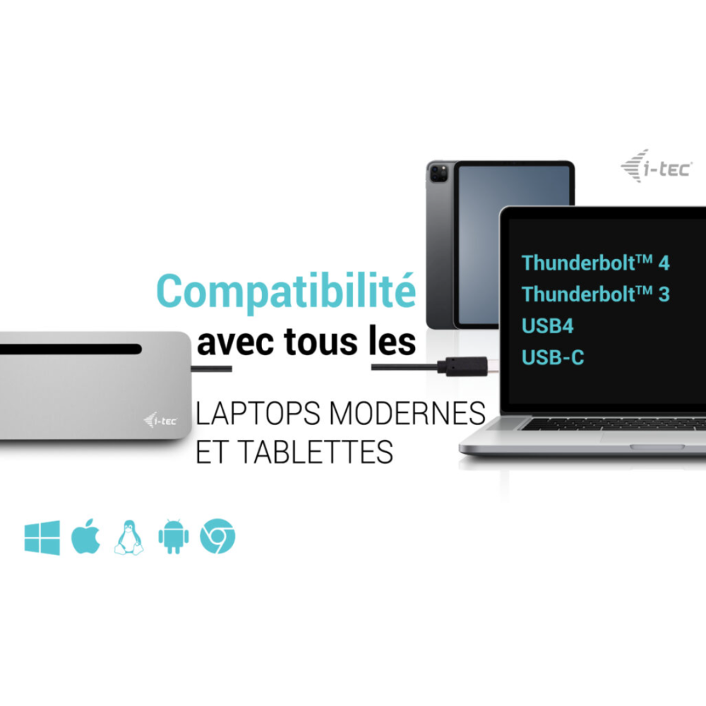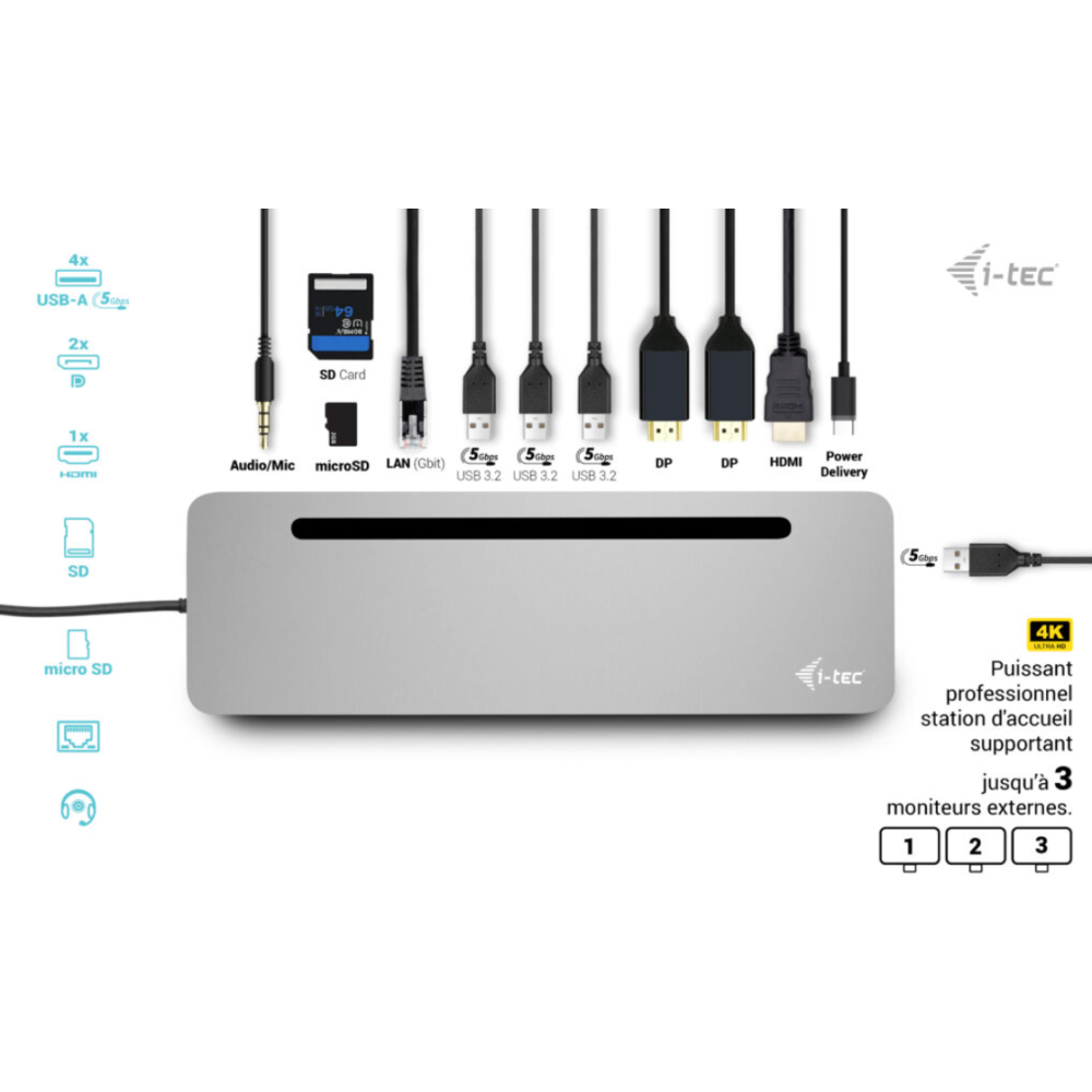 Station d'accueil USB-C ergonomique en métal avec prise en charge d'un maximum de 3 moniteurs externes - Le dock est compatible avec tout ordinateur portable équipé d'un port USB-C ou Thunderbolt - La station d'accueil offre 4 ports USB, une connectivité fiable et rapide aux réseaux d'entreprise grâce au port LAN intégré et une alimentation électrique jusqu'à 100 W - Le design de la station d'accueil lui permet également d'être utilisée comme support d'ordinateur portable - Station d'accueil - pour tablette, ordinateur portable - USB-C / USB4 / Thunderbolt 3 / Thunderbolt 4 - 11-slot - HDMI, 2 x DP - 1GbE - 100 Watt.