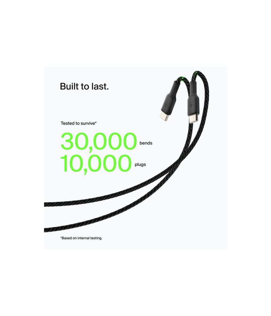 Charge rapide jusqu'à 240 W pour les ordinateurs portables, tablettes et smartphones - Recharge rapide d'un MacBook Pro 14” de zéro à 50 % en 31 minutes - Câble doté de deux puces électroniques et d'une fonction de sécurité anti-surchauffe pour une alimentation électrique sécurisée - Connecteurs durables en aluminium anodisé - Revêtement en nylon doublement tressé testé pour résister à plus de 30 000 flexions - Câble certifié USB-IF et conforme USB 2.0 - Compatibilité universelle avec MacBook, Chromebook, iPad et une large gamme d'autres appareils USB-C - Puissance nominale: 48 V / 5 A, 240 W - Longueur du câble intégré 2M - Câble à gaine tressée en nylon.