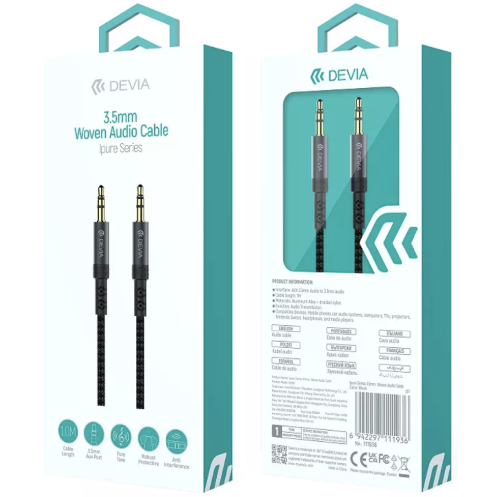 Cable audio tissé DEVIA Ipure Series 3-5mm - Marque : Devia - Modèle : EC618 - Longueur du câble : 1 mètre - Connecteurs : mini-jack 3,5 mm ↔ mini-jack 3,5 mm - EAN : 6942297111936. Coloris: noir.