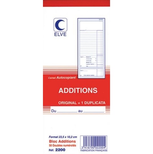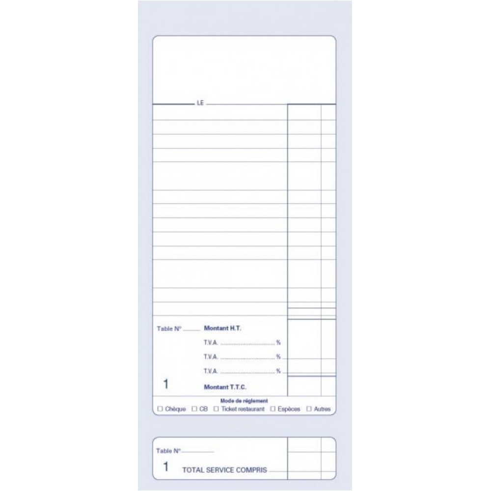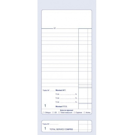 Bloc autocopiant numéroté de 50 feuillets. Dupli. Double numérotation sur chaque liasse, coupon détachable en pied. Dos toilé. Dimensions 10,2 x 23,5 cm. Comporte 3 lignes pour les 3 taux de TVA.
