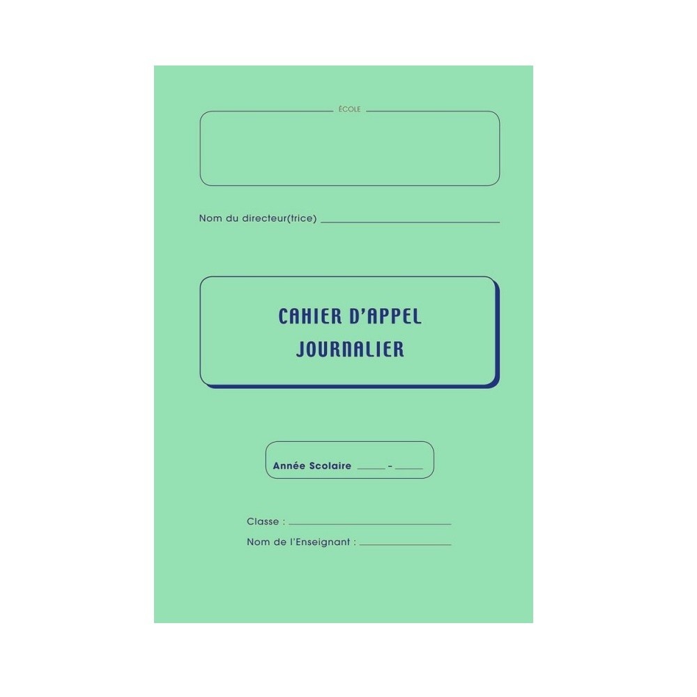 Registre d'appel journalier, piqûre 28 pages, 40 élèves - couverture carton 224 g/m2 couleur vert, papier 100 g/m2, 24 pages avec découpe latérale pour éviter le report du nom des élèves - Dimensions: 297 x 210 mm