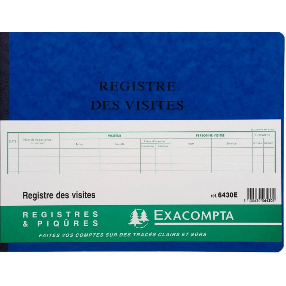 La clarté des tracés Exacompta et leur qualité d'impression avec une encre verte spéciale sont reconnues et appréciées depuis des années. Le registre des visites permet de consigner les entrées et sorties des visiteurs, indispensables dans la plupart des lieux publiques et entreprises. Chaque page est numérotée pour éviter les ruptures et falsifications. Le Papier 110 g/m2 est légèrement teinté, spécialement étudié pour reposer la vue, et mat pour une écriture facile et nette. Il est certifié FSC®, un mode de gestion responsable des forêts. La couverture en carte lustrée est issue de nos papeteries Clairefontaine, elle est noble, rigide, résistante et écologique car également certifiée FSC®. Les piqûres et registres Exacompta sont fabriqués à 100% en France. Dimensions : 250x320mm. Matière : Papier. Couleur / Teinte : Bleu. Format : Horizontale. Poids : 0,450 kg. 80 pages.