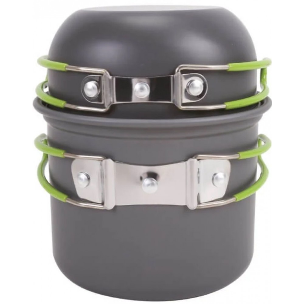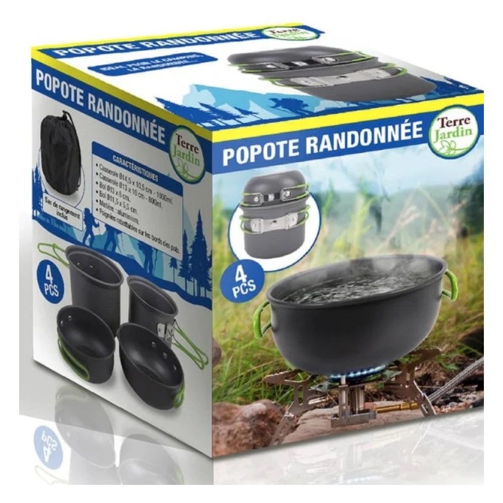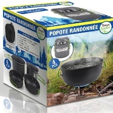 La caractéristique de la popote qui en fait tout son atout est que ces casseroles sont antiadhésives. Ce qui vous facilitera la cuisson mais aussi le nettoyage de celles-ci ! Ce kit de cuisson du randonneur est donc un indispensable de vos sorties trekking en montagne. Informations techniques. Matière : aluminium. Dimensions (tous pliés) : hauteur : 17 cm, diamètre : 14,5 cm. Dimensions grande casserole : diamètre : 14,5 cm, hauteur : 11 cm. Dimensions petite casserole : diamètre : 13,3 cm, hauteur 10 cm. Dimensions grand bol : diamètre : 13 cm, hauteur : 6 cm. Dimensions petit bol : diamètre : 11,5 cm, hauteur : 5,5 cm. Poids : environ 540 gr. Coloris : noir. Contenance : grande casserole : 1000 ml, petite casserole : 800 ml. Lot de 4 pièces : 2 casseroles et 2 bols. Caractéristiques : poignés rabattables sur les rebords des casseroles et bols livrés avec sac de rangement. S'emboîtent tous pour un rangement optimisé.