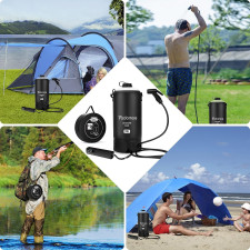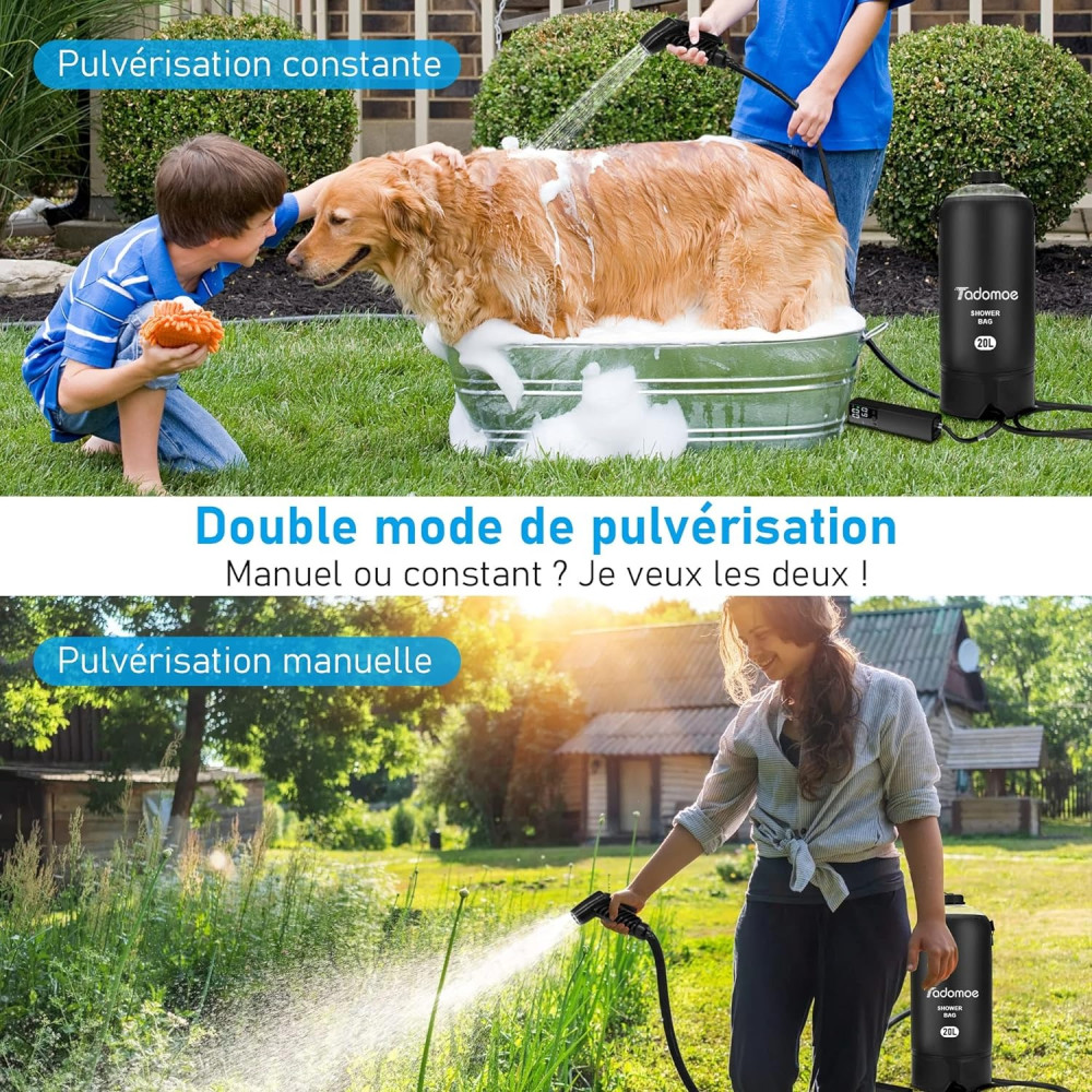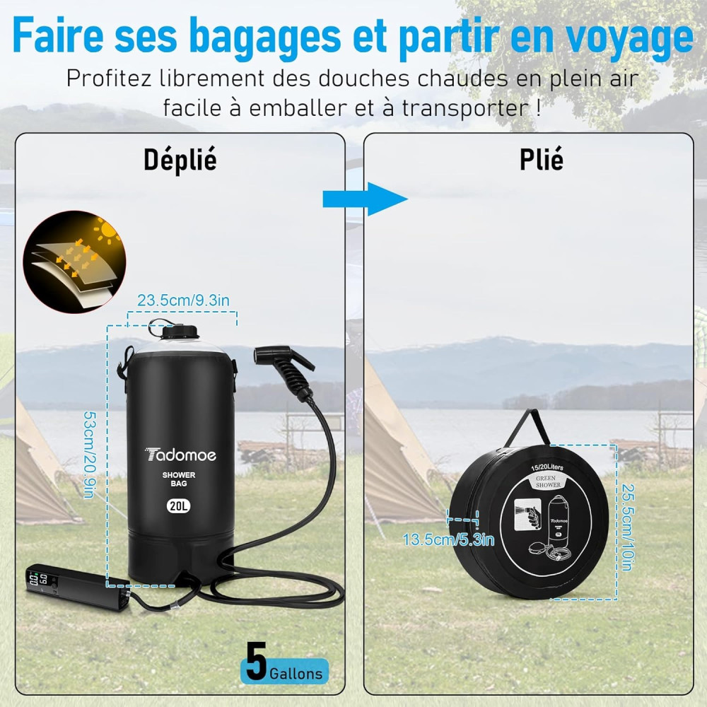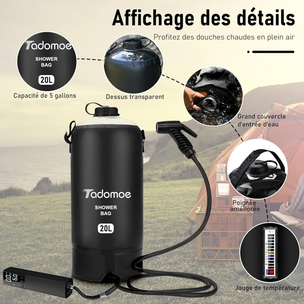 TADOMOE douche Solaire - Capacité : 5 gallons / 20 litres - Pompe à air portable intelligente pour regonfler/arrêter automatiquement le pompage - Jet constant et mode manuel pour un contrôle plus facile - Douche solaire - se réchauffe au soleil pour une douche chaude et apaisante - Ne pas dépasser 50 degrés si l'eau chaude est nécessaire - Ajoutez un peu de soda dans le sac de douche pour le nettoyer lors de la première utilisation - Ne buvez pas et videz l'eau lorsque vous ne l'utilisez pas - Fabriqué en PVC, ne pas toucher les objets pointus pour éviter les rayures - La pompe de douche s'éteint automatiquement si elle détecte que le sac de douche n'est pas utilisé - Veuillez cliquer sur le bouton d'alimentation pour redémarrer la pompe à air - Sac de douche de haute qualité pour le camping - Pomme de douche portable avec tuyau, deux niveaux de jet réglables ; matériau PVC écologique, bien ajusté et étanche ; bouchon à vis facile à remplir ; poignée renforcée et plus durable ; le haut transparent indique distinctement la quantité d'eau - Pompe de douche intelligente rechargeable - La pompe de douche de camping est dotée d'un système intelligent de détection de la pression. Elle cessera de fonctionner lorsque la pression d'air du sac de douche atteindra 6,0 PSI et se mettra automatiquement en marche lorsque la pression d'air sera inférieure à 5,0 PSI. Et la lampe de poche en bas de l'appareil est adaptée aux situations d'urgence.