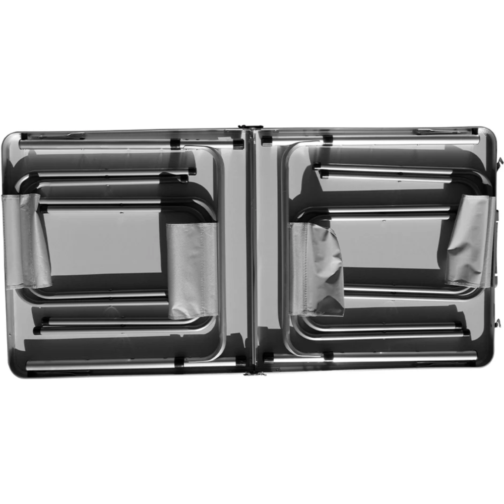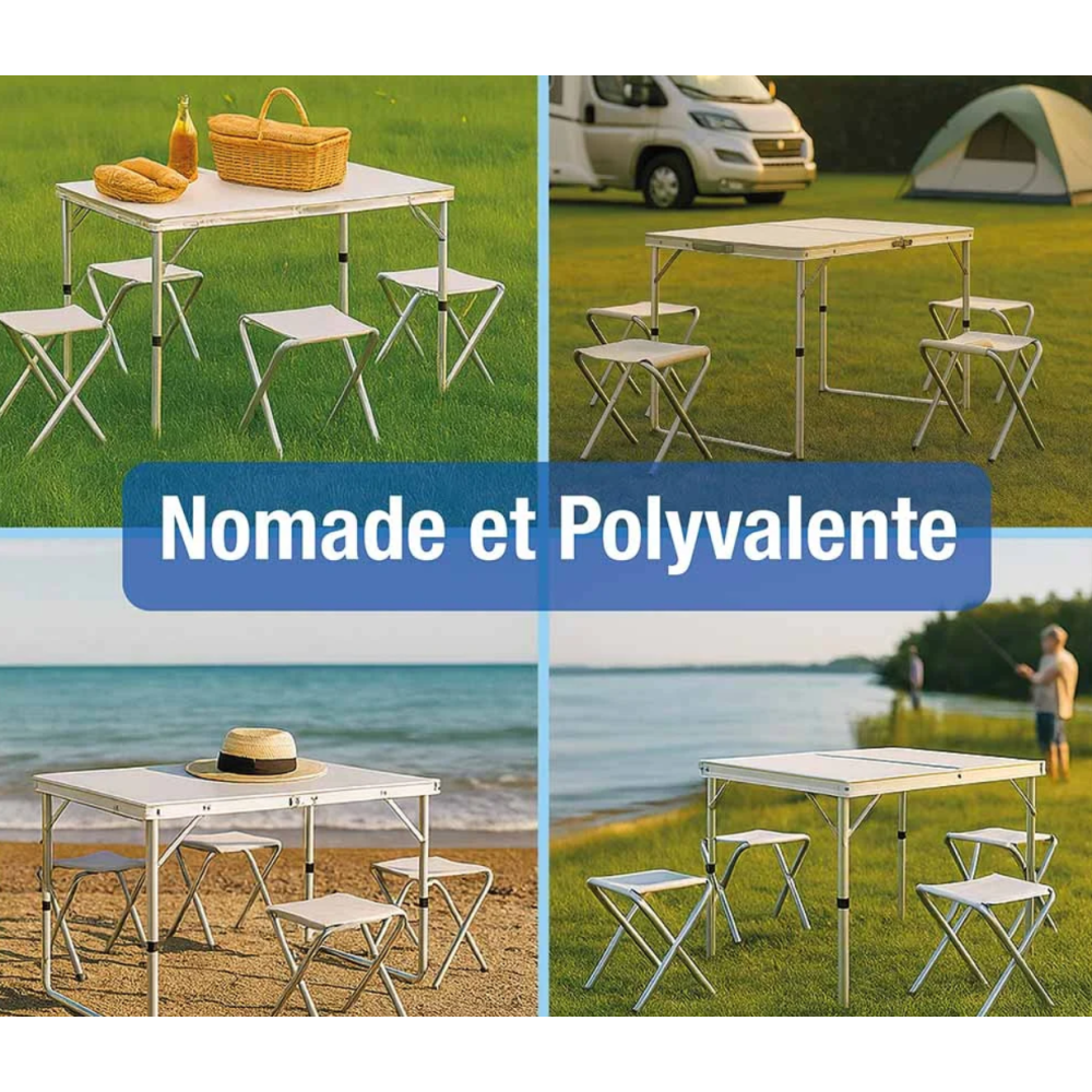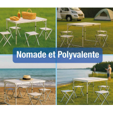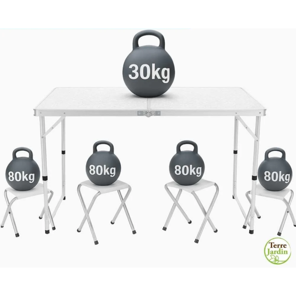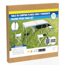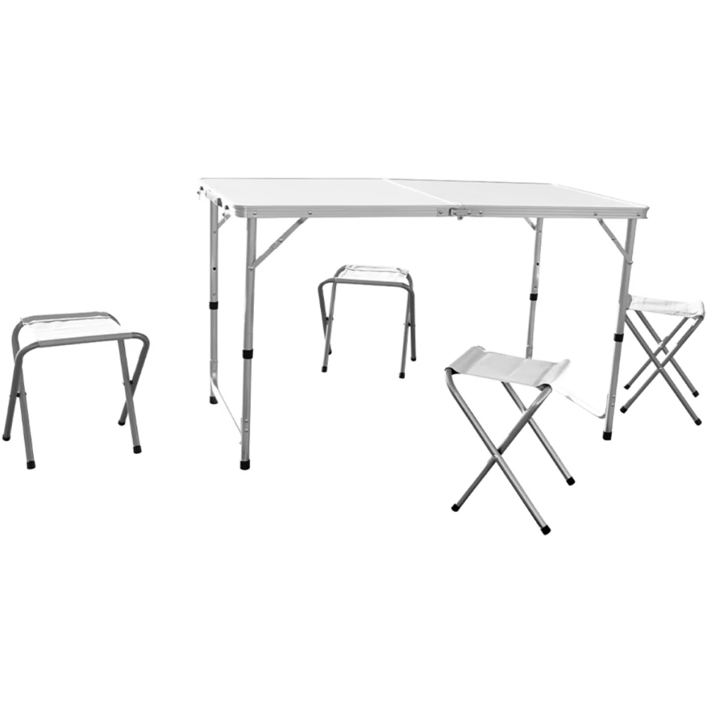 Table de camping pliable fabriquée en aluminium - Accompagnée de 4 tabourets recouverts en tissu Oxford 600D pour passer des moments agréables en extérieur en famille ou lors de pique-niques entre amis. Dispose d’une hauteur réglable sur 3 niveaux - Propose un montage rapide et un rangement facile de par son design pliable - Dotée d’un plateau MDF résistant aux chocs - Dimensions de la table : L. 120 x l. 60 x H. 54 / 61 / 70 cm - Dimensions pliée : L. 60 x l. 60 x E. 6,5 cm - Dimensions d’un tabouret : L. 26,5 x P. 27 x H. 36,5 cm - Fait un poids total de 4,3 kg.