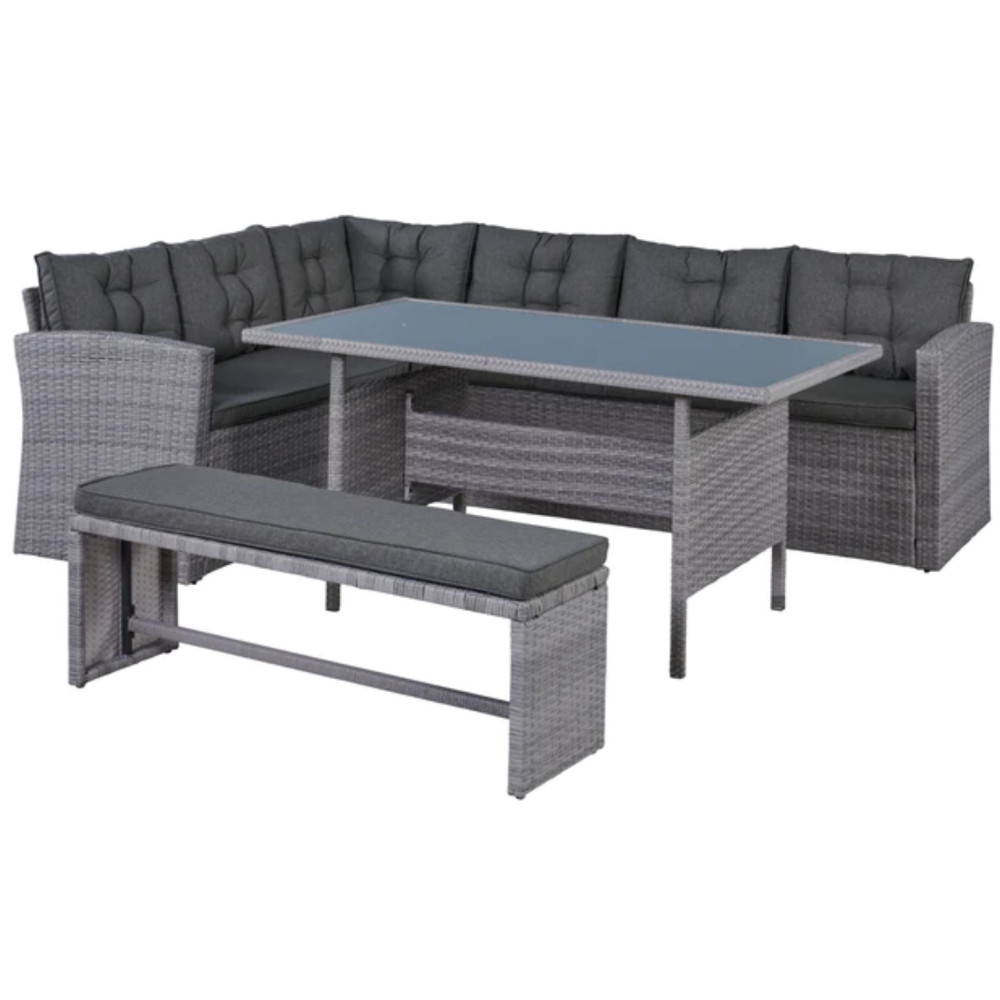 Le salon de jardin Cuba dispose d'une structure en acier tubulaire thermolaqué - Les surfaces sont en entoilage tressé plat FlexMesh recyclable et de haute qualité en gris clair - Les coussins d'assise et de dossier en polyester en gris foncé avec rembourrage en mousse / non-tissé sont munis d'une fermeture éclair  - Le plateau de table est en verre de sécurité laiteux et présente une épaisseur de 5 mm - Le set comprend : 1 x canapé (HxlxP) 175 x 66 x 73 cm - 1 x canapé (HxlxP) 168 x 66 x 73 cm - 1 x banquette (HxlxP) 120 x 34 x 45 cm - 1 x table (HxlxP) 145 x 80 x 70 cm.