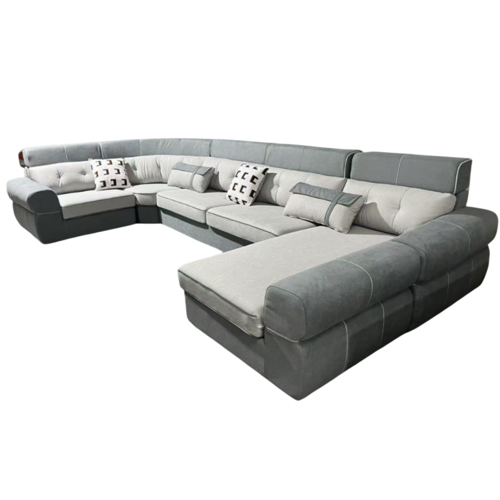 Apportez confort et modernité à votre intérieur avec le salon U panoramique 2568, un canapé généreux conçu pour accueillir jusqu’à 7 personnes. Sa forme en U crée un espace convivial parfait pour se détendre en famille ou recevoir des invités. Revêtu d’un tissu microfibre gris clair, il offre un style élégant et lumineux, facile à intégrer dans tout type de décoration. Entièrement déhoussable, il est pratique à entretenir au quotidien. Son assise confortable en mousse polyuréthane et ses repose-têtes assurent un excellent maintien. Coussins inclus. Dimensions: 410 x 210x 190 cm.