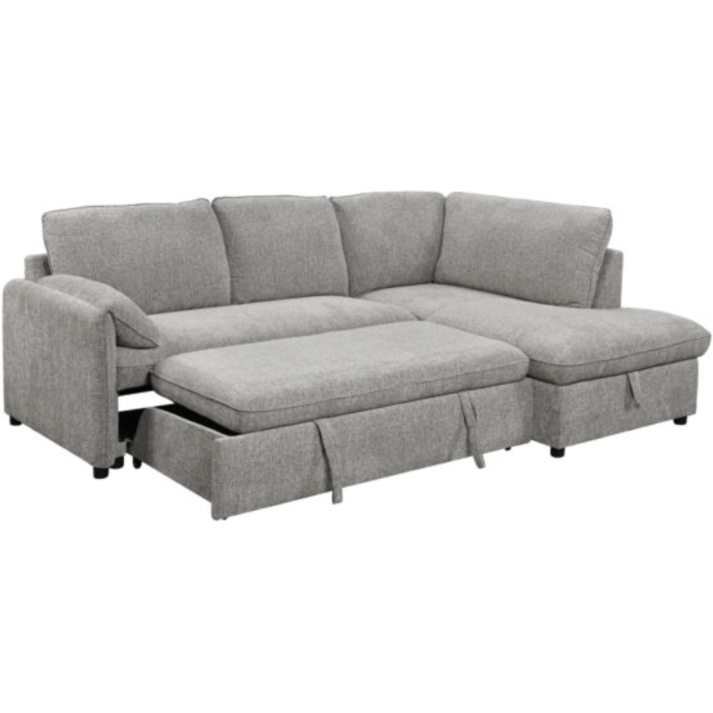 canapé contemporain d'angle convertible coffre KF7825 240x169x91 - Nombre de places relax 4 - Revêtement tissu - Dispose d'une assise ferme et des coussins du dossier confortables - Se transforme en lit pour deux personnes en retirant les coussins et en relevant le tiroir lit - Doté d'un coffre de rangement. Coloris: gris clair.
