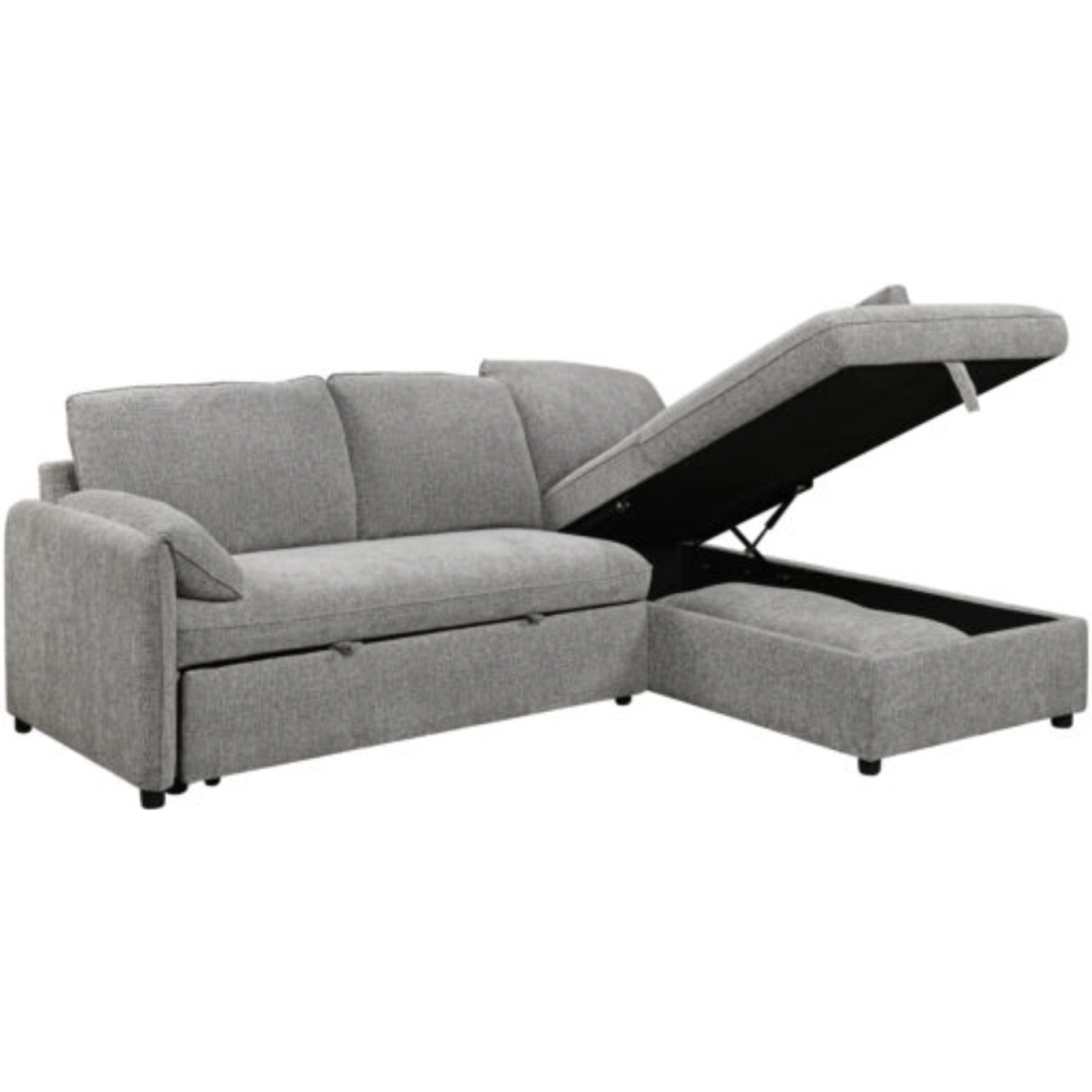 Canapé contemporain d'angle convertible coffre KF7825 240x169x91 - Nombre de places relax 4 - Revêtement tissu - Dispose d'une assise ferme et des coussins du dossier confortables - Se transforme en lit pour deux personnes en retirant les coussins et en relevant le tiroir lit - Doté d'un coffre de rangement.