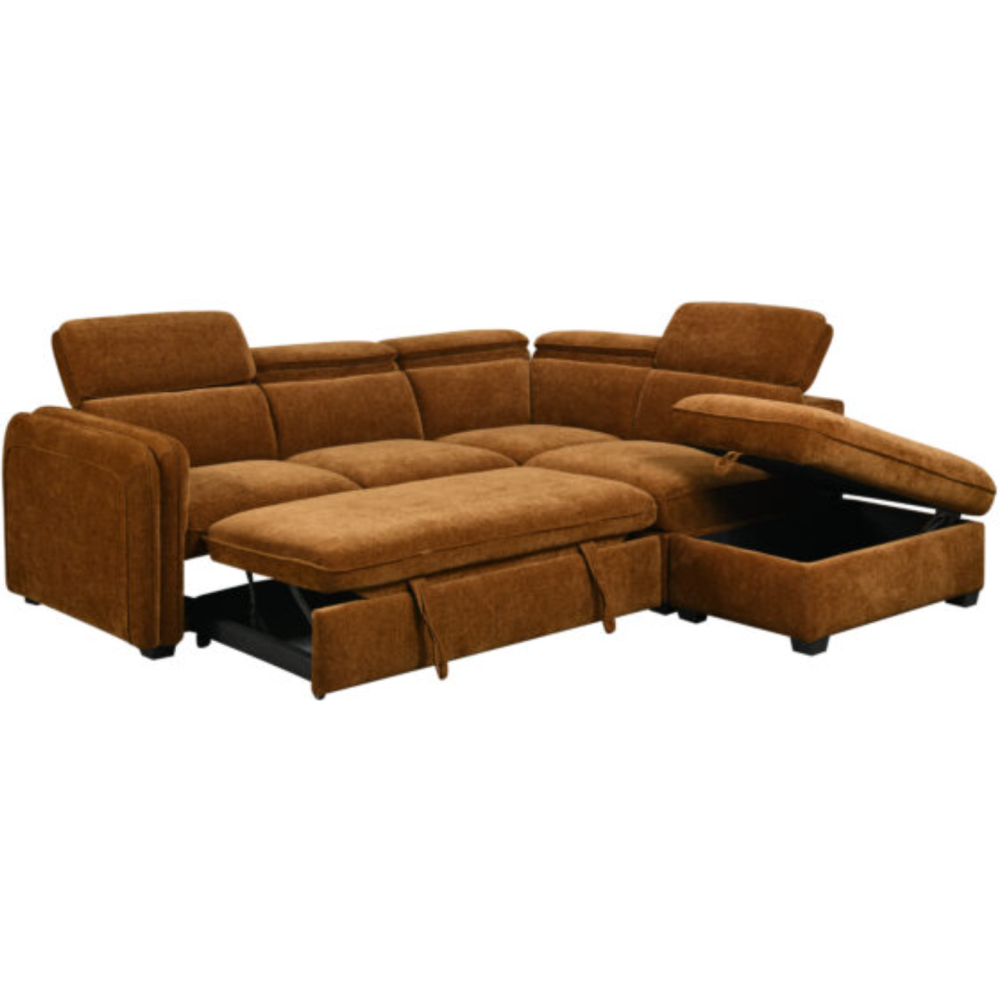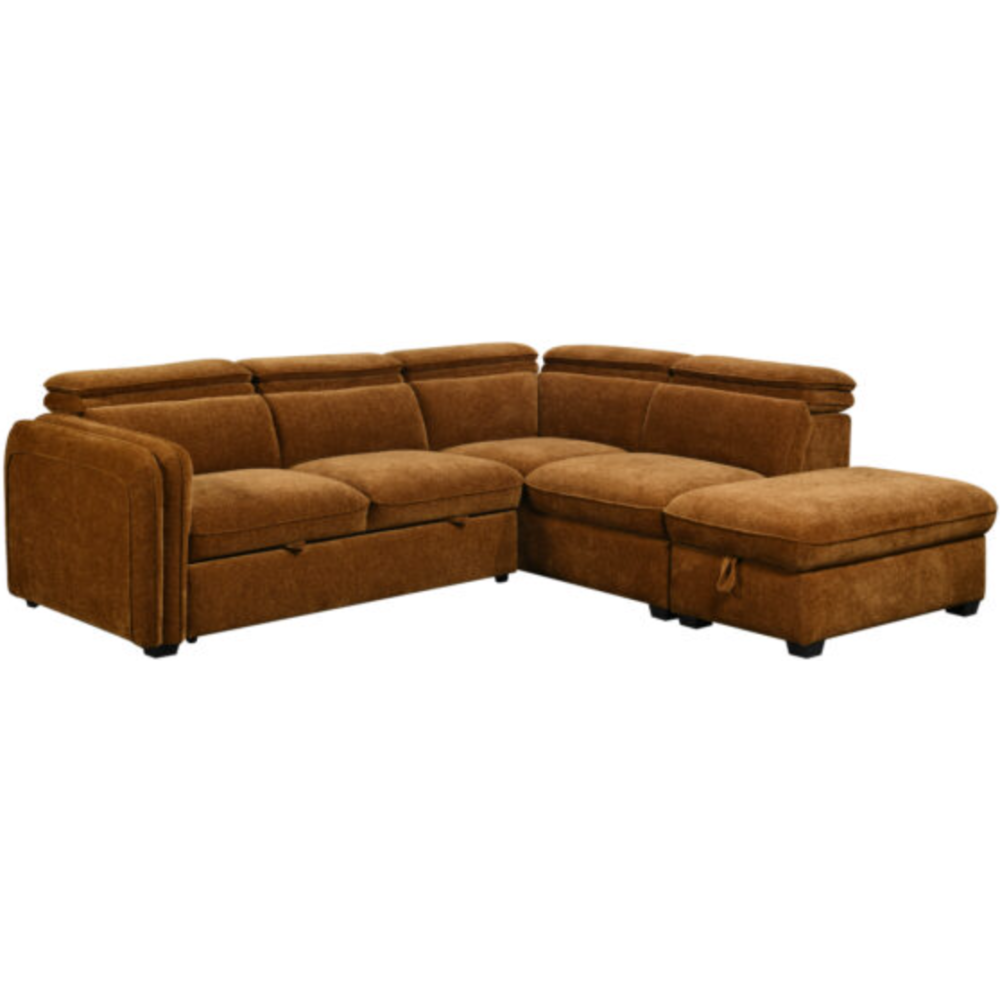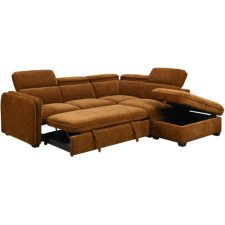 Salon d'angle convertible coffre KF7845 257x231x81 de 5 places en tissu orange apporte style et confort à votre salon - Conçu pour optimiser votre espace de vie - Design moderne avec des lignes épurées et une méridienne spacieuse - Asssise large et coussins généreux offrent un confort optimal - Se transforme en lit coffre, offrant à la fois un espace de rangement discret et une solution de couchage supplémentaire sans compromis sur le style. Coloris: Camel.