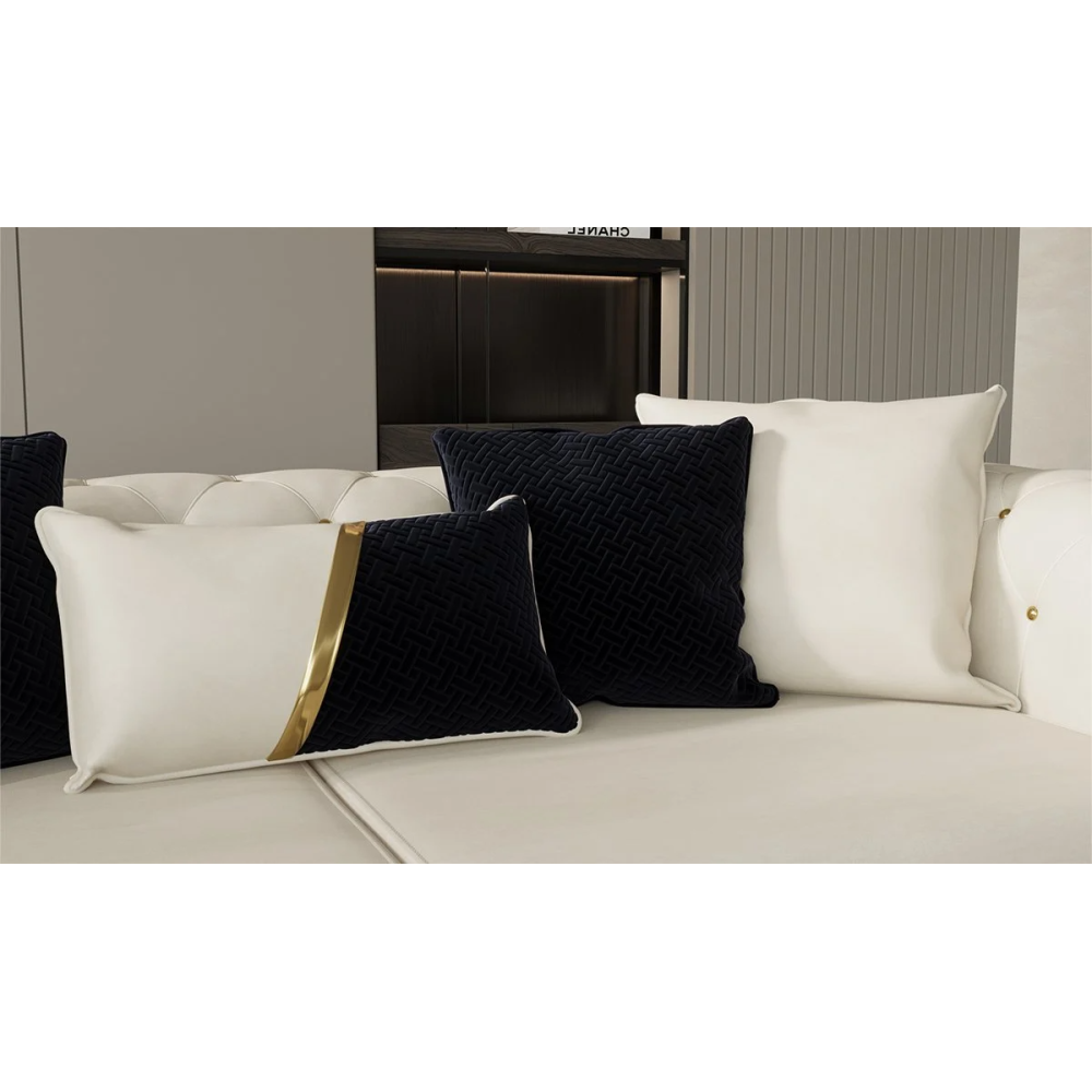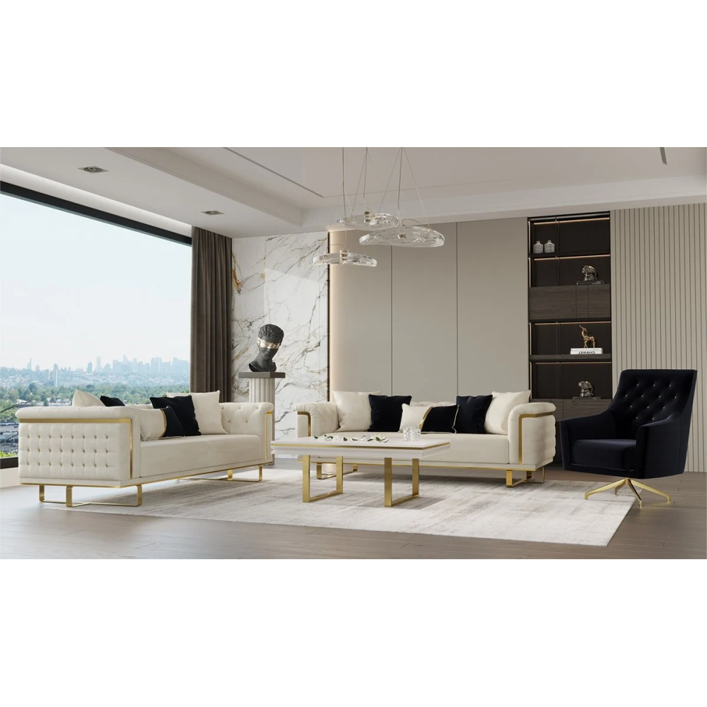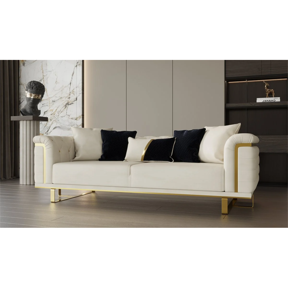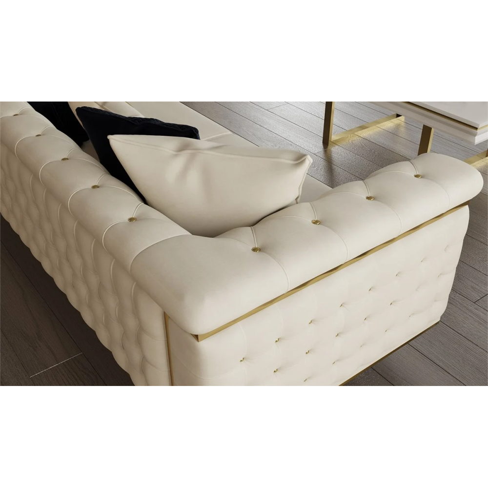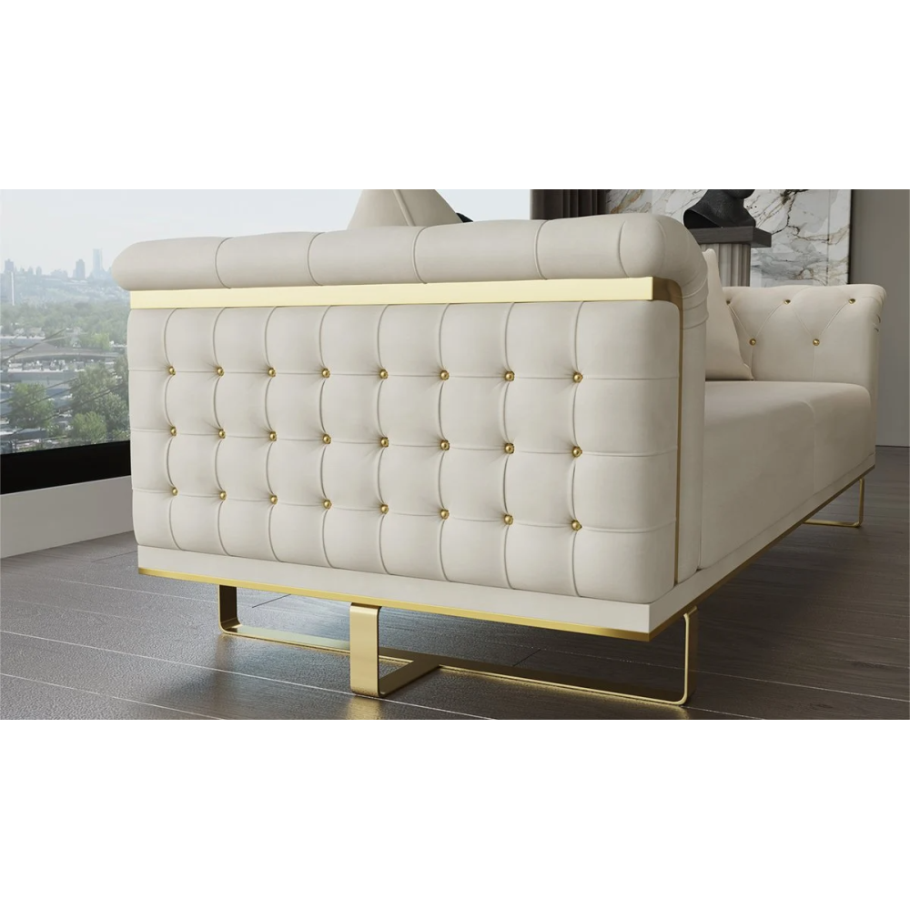 Le salon VANESA 3+3+1 incarne l’élégance contemporaine et le luxe raffiné. Composé de deux canapés trois places (233×71×98 cm) et d’une bergère (79×100×84 cm), il combine confort et sophistication. Son revêtement beige lumineux, sublimé par des détails dorés et des pieds métalliques, apporte une touche prestigieuse à tout intérieur. Les accoudoirs capitonnés créent une allure moderne et chic. Le salon VANESA offre un confort exceptionnel et une finition haut de gamme, idéale pour les espaces élégants et accueillants.