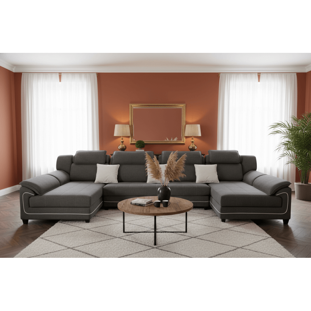 Offrez à votre salon confort et élégance avec le salon U panoramique 1132, un canapé spacieux idéal pour les grands espaces. Avec sa forme en U, il accueille facilement jusqu’à 7 personnes, parfait pour les moments en famille ou entre amis. Son revêtement en tissu microfibre gris foncé apporte une touche moderne et s’adapte à tous les styles de décoration. Entièrement déhoussable, il est facile à entretenir au quotidien. Conçu avec une mousse polyuréthane pour un confort durable, il dispose également de repose-têtes pour un maintien optimal. Coussins inclus. Dimensions: 410 x 210 x 190 cm.