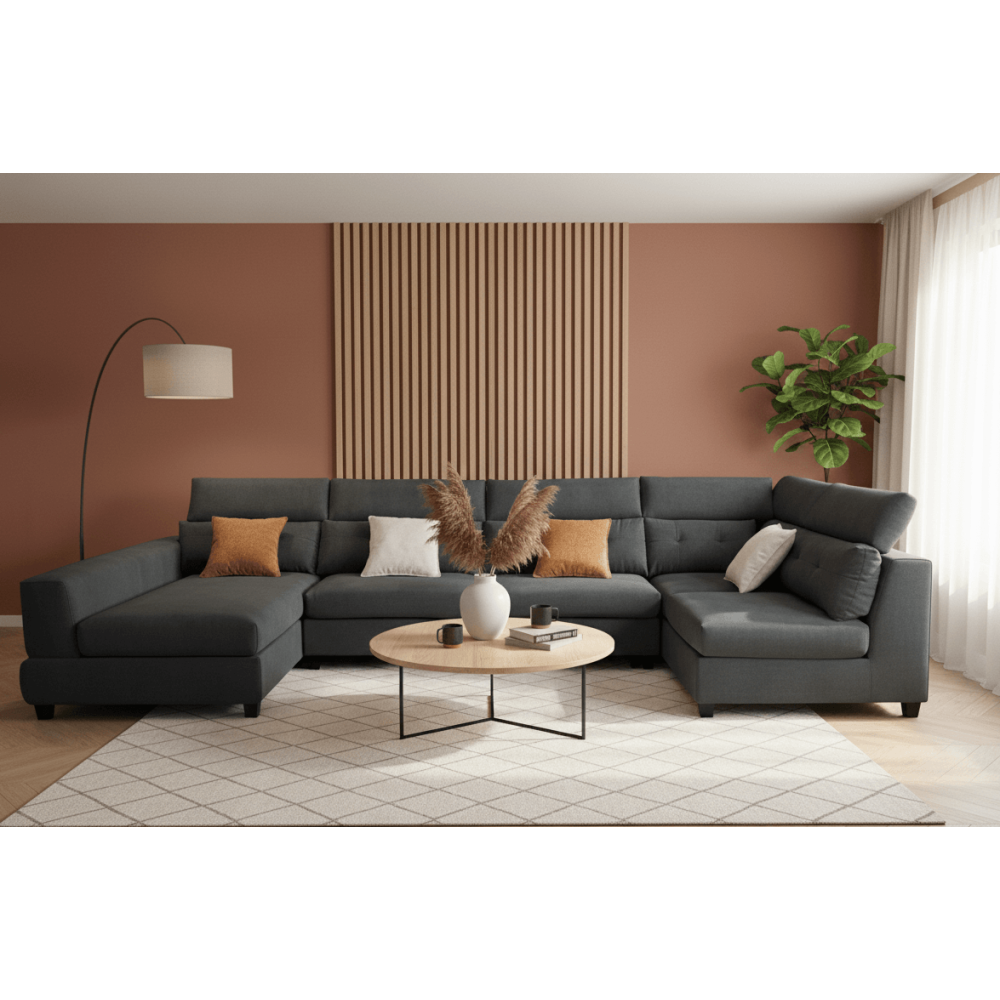 Offrez à votre salon confort et élégance avec le salon U panoramique 1132, un canapé spacieux idéal pour les grands espaces. Avec sa forme en U, il accueille facilement jusqu’à 7 personnes, parfait pour les moments en famille ou entre amis. Son revêtement en tissu microfibre gris foncé apporte une touche moderne et s’adapte à tous les styles de décoration. Entièrement déhoussable, il est facile à entretenir au quotidien. Conçu avec une mousse polyuréthane pour un confort durable, il dispose également de repose-têtes pour un maintien optimal. Coussins inclus. Dimensions: 410 x 210 x 190 cm.