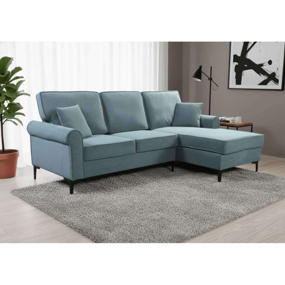 Apportez une touche tendance et confortable à votre intérieur avec ce canapé d’angle moderne au design élégant. Son assise généreuse et sa méridienne spacieuse offrent un véritable espace de détente, idéal pour se relaxer au quotidien ou recevoir. Ses coussins moelleux assurent un excellent maintien, tandis que ses pieds fins apportent légèreté et style. Revêtu d’un tissu bleu clair doux et raffiné, il s’intègre facilement dans une décoration contemporaine. Dimensions : 215 x 146 x 84/87 cm, parfait pour optimiser l’espace sans compromis sur le confort.