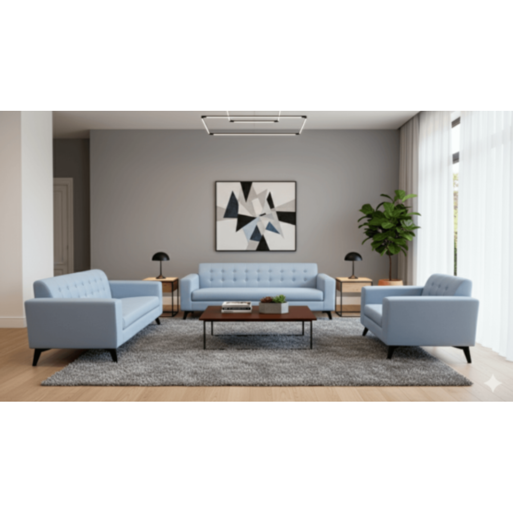 Salon de 3 canapés IBT899 somptueux tissu bleu effet lin - Très confortable avec une bonne profondeur d'assise - Style scandinave rétro - Meuble aux lignes épurées et au joli design constituant un réel élément décoratif dans n'importe quel espace de vie - Monté sur des pieds en bois légèrement oblique - Doté d'un dossier capitonné et d'une assise au grand confort - Canapé de 3 places chacun - Dimensions: 91x81x78 cm, 153x81x78 cm, 194x81x78 cm.