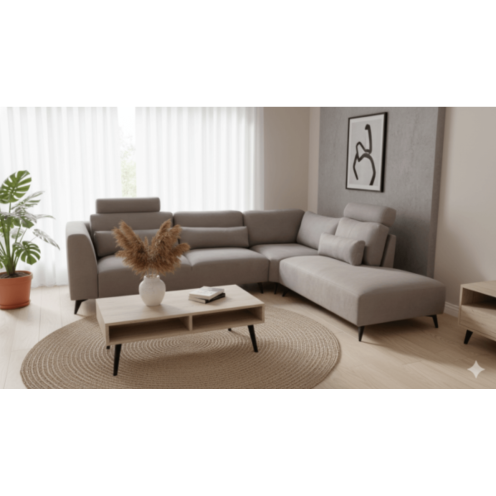 Salon d'angle 3 places couleur taupe élégant et fonctionnel 1234 - Finition en tissu 100% polyester - Pieds en métal - Design moderne parfaitement adaptable aux espaces de vie contemporains - Est doté de têtières ajustables qui assurent un confort sur mesure - Dispose d'une structure robuste et fiable - Assure une assise des plus confortables avec un garnissage en mousse - L'angle du canapé est fixe - Bénéficie de 3 coussins de siège pour une posture plus à l'aise lors de l'assise - Dimensions : 275 x 215 x 89 cm.