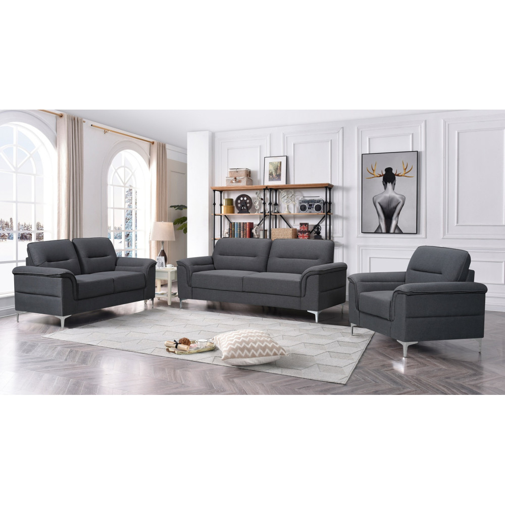 Salon complet Lusk extrêmement confortable comprenant 2 canapés et un fauteuil gris foncés avec assise en ressorts ensachés + mousse neuve (bordure des ressorts ensachés en mousse recyclée) - Pieds chromés - Coussin de dossier amovible - Revêtement en Lin - Emballage souple - Structure en bois massif - Dimensions canapé 3 places : (LxPxH) 203x89x92cm - Dimensions canapé 2 places : (LxPxH) 163x89x92cm - Dimensions fauteuil 1 place : (LxPxH) 110x89x92cm