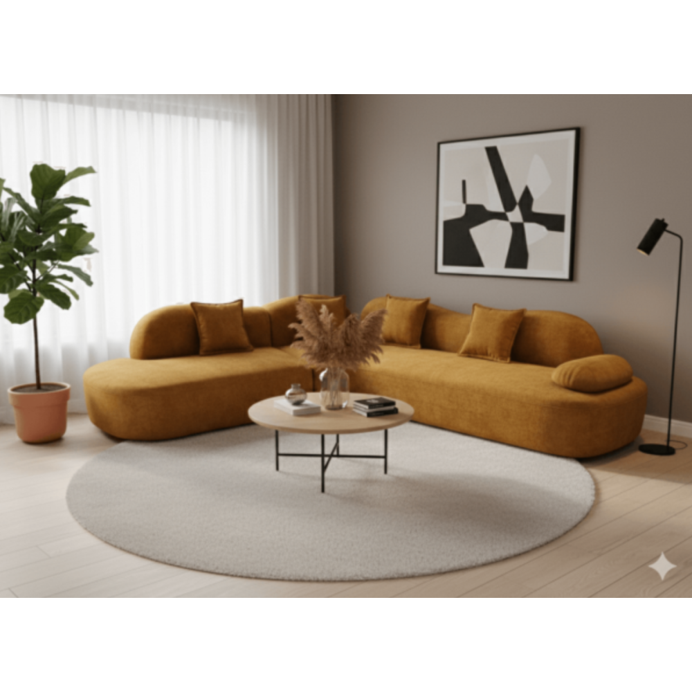 L’ensemble du canapé d’angle YENI BELLA séduit par son design moderne et raffiné, alliant élégance et confort. Ses lignes épurées, rehaussées de détails dorés et métalliques, subliment votre intérieur avec une touche luxueuse. Le dossier haut offre une assise confortable et se transforme ingénieusement en table basse, optimisant ainsi l’espace de vie. Grâce à ses pieds élancés, le nettoyage devient facile et l’esthétique reste légère et harmonieuse. Parfait pour les salons contemporains, le Bella invite à la détente et à la convivialité. Dimensions : section longue 294 × 80 × 94 cm ; court épisode 235 × 80 × 94 cm.