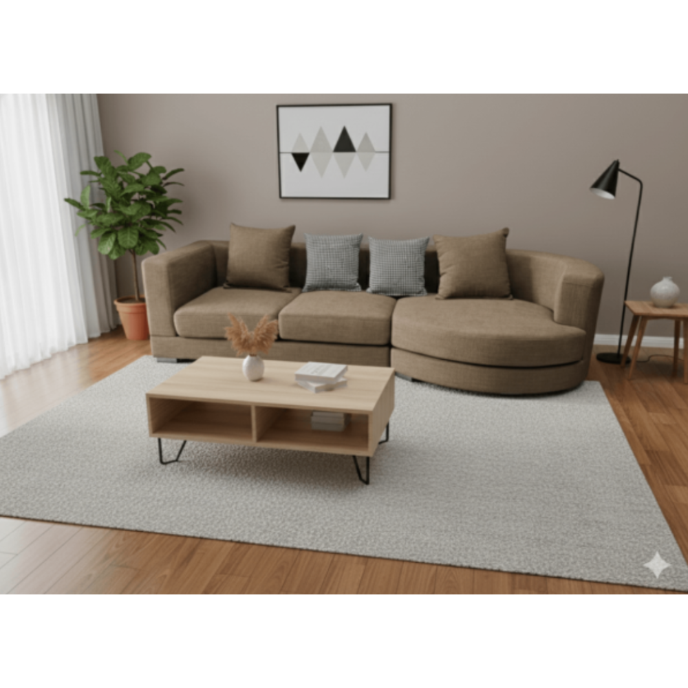 Salon d’angle moderne facile à installer ou désinstaller - Composé de 2 coussins d’assise carrés et 1 coussin fantaisiste affichant une forme arrondie vers l’extérieur - Doté d’une rampe arrière qui joue à la fois le rôle de dossier et d’accoudoirs - Convient pour toutes les salles de séjour - Dispose de petits supports stabilisateurs bas qui maintiennent le meuble fixe sans être trop voyant - Habillé d’un revêtement en tissu constitué de fibres et arborant un coloris marron froid.