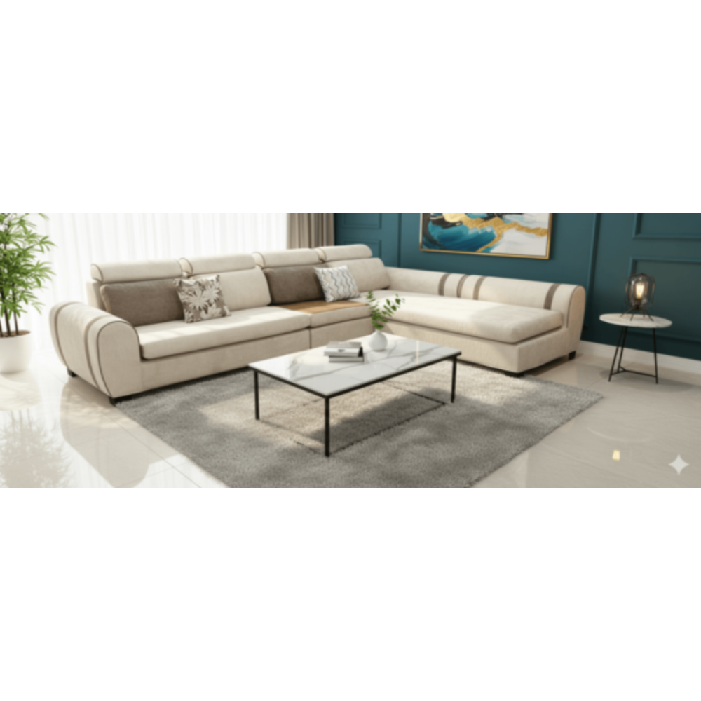 L’ensemble du canapé d’angle YENI BELLA séduit par son design moderne et raffiné, alliant élégance et confort. Ses lignes épurées, rehaussées de détails dorés et métalliques, subliment votre intérieur avec une touche luxueuse. Le dossier haut offre une assise confortable et se transforme ingénieusement en table basse, optimisant ainsi l’espace de vie. Grâce à ses pieds élancés, le nettoyage devient facile et l’esthétique reste légère et harmonieuse. Parfait pour les salons contemporains, le Bella invite à la détente et à la convivialité. Dimensions : section longue 294 × 80 × 94 cm ; court épisode 235 × 80 × 94 cm.