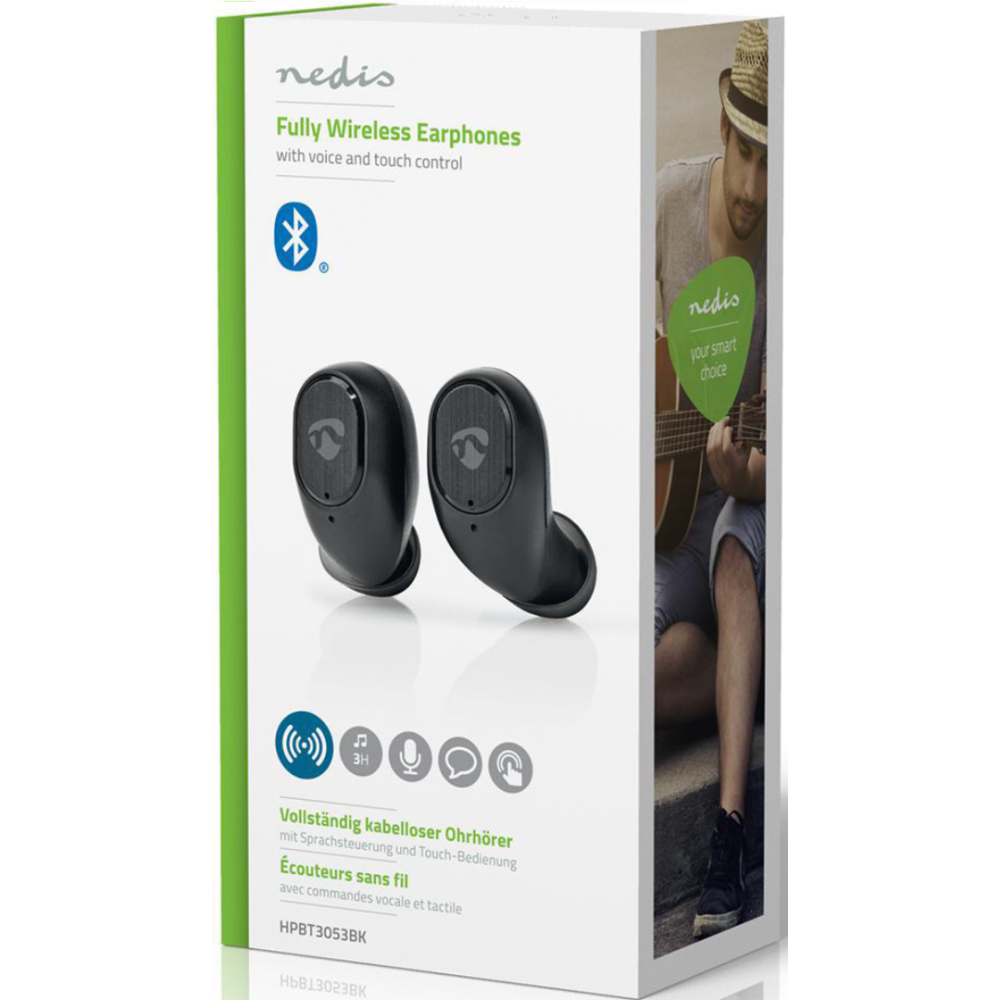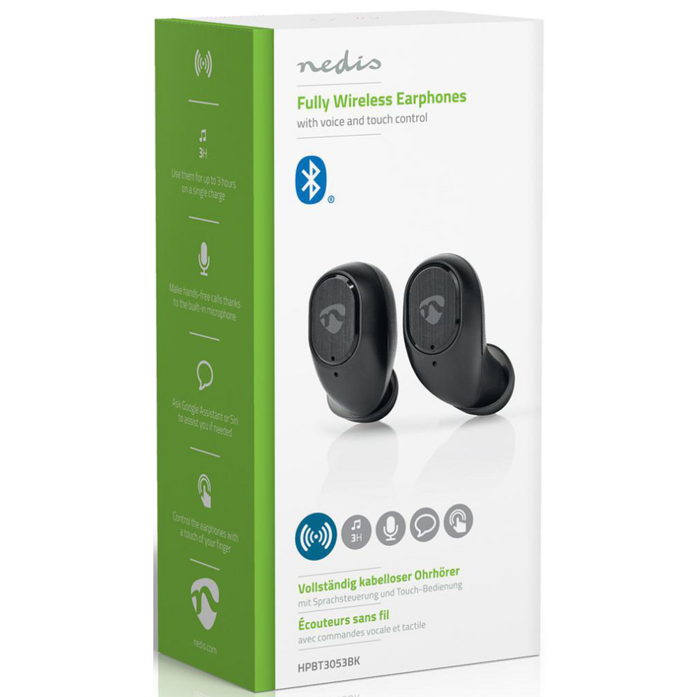 Ecouteurs sans fil BTH Nedis avec commande vocale - Fournis avec un étui rechargeable pour un chargement facile sans fil - Offrent 3 heures d'autonomie et l'étui 3 charges complètes supplémentaires - Excellente qualité sonore grâce aux membranes de 8 mm intégrées - 100% ergonomiques - Compatibles avec l'Assistant Google et Siri - Bénéficient d'une commande tactile - Microphone intégré pour des appels en mode mains libres - Technologie Bluetooth 5.0 pour une connexion stable et sans interférences - Equipés d'un câble de chargement, de 3 paires d'embouts (S/M/L) et d'un guide de démarrage rapide - Indicateur de niveau de batterie intégré - Coloris noir.