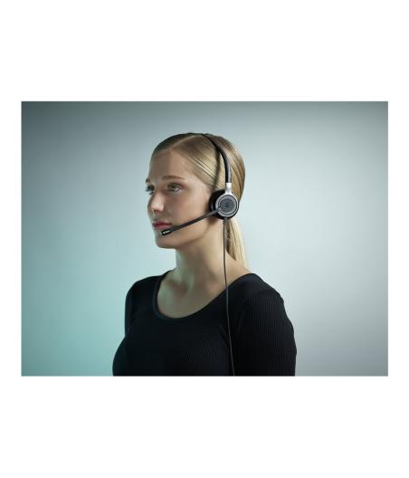 | Micro-casque filaire USB binaural avec réduction de bruit active et capteur de proximité. Cette solution pour centres de contacts et bureaux vous offre un son supérieur, un traitement simplifié des appels, une grande résistance et un confort prolongé. | |