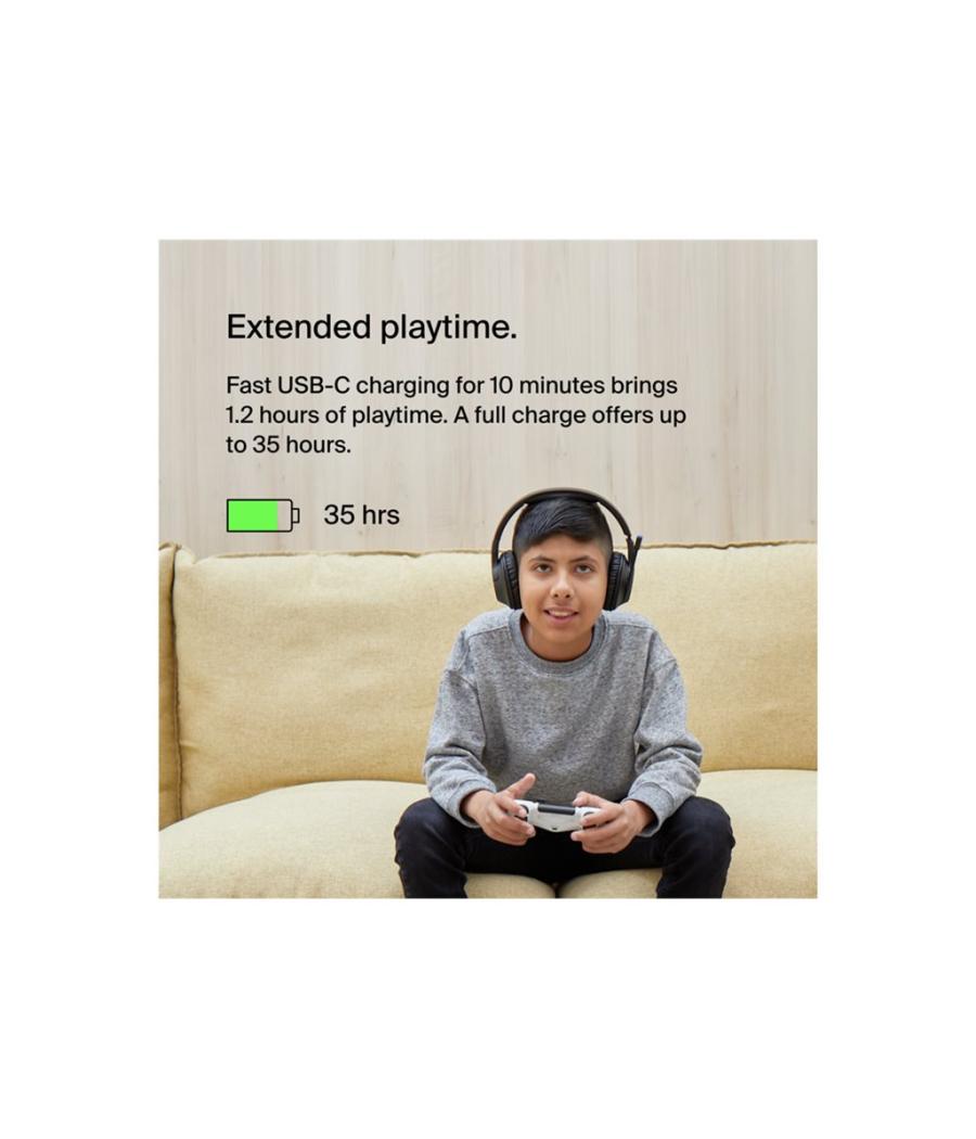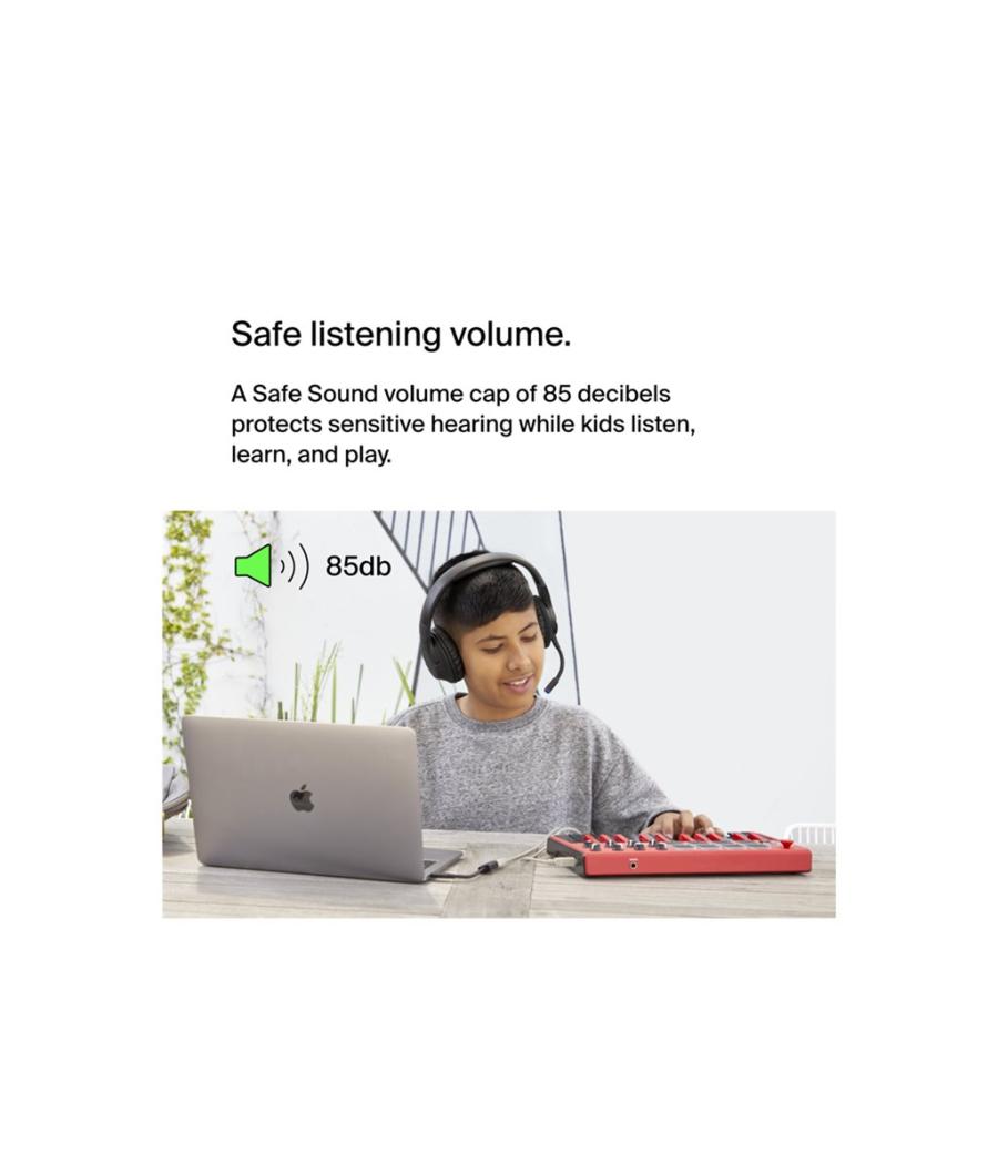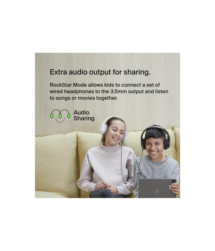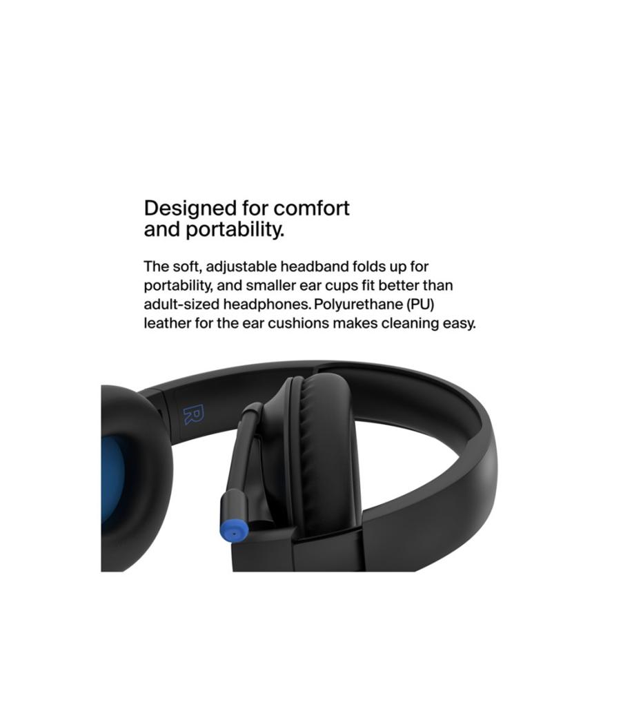 Ce casque supra-auriculaire sans fil SoundForm Inspire pour enfants, confortable et de haute qualité, est conçu spécialement pour les enfants. La technologie Safe Sound limite le volume à 85 dB pendant l'apprentissage à distance, les voyages ou la lecture de vidéos en ligne. Des coussinets souples et plus petits ainsi qu'un bandeau réglable garantissent une excellente adaptation aux oreilles de petite taille. Le bandeau pliable est conçu pour être transporté et placé dans un sac ou un sac à dos. Le mode RockStar est doté d'une sortie 3,5 mm qui permet aux enfants de partager des contenus audio avec un camarade de classe ou un ami. De plus, un micro à perche de qualité permet de conserver un son clair pendant l'apprentissage à distance, avec un témoin lumineux pour savoir si le casque est en mode silencieux.