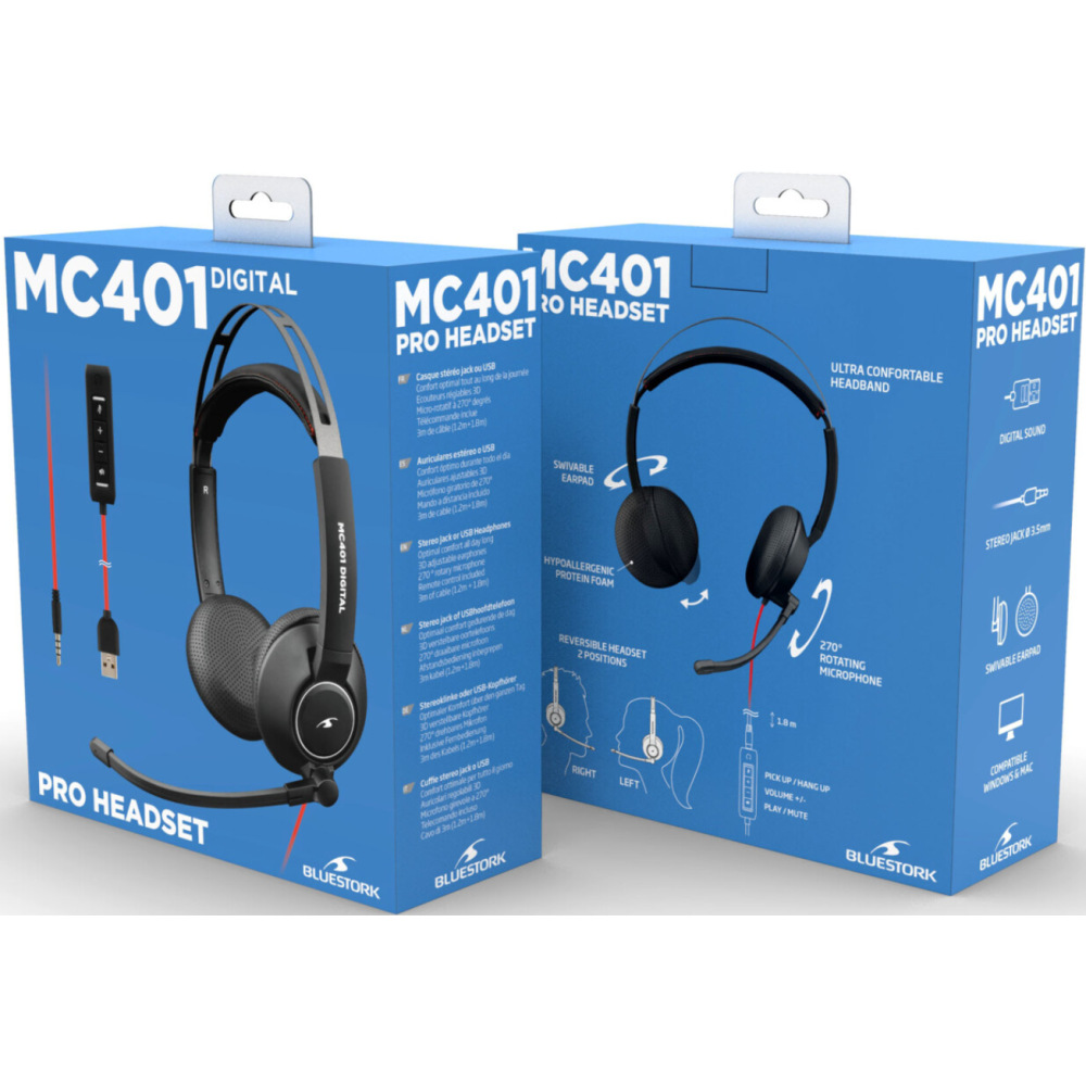 Micro-casque audio stéréo - Marque : BLUESTORK - Modèle : MC-202 - Type de port : Circum-aural - Couplage auriculaire : Supra-auriculaire - Configuration : Casque fermé - Utilisation : Bureautique - Couleur principale : Noir - Conception : Légère et ultra-confortable - Réduction de bruit : Oui - Connectivité : Filaire - Connecteur : Jack 3,5 mm mâle stéréo - Compatibilité : PC, Mac - Sans fil : Non - Pliable : Non - Son Surround : Non - LED RGB : Non - Mono / Stéréo : Stéréo - Réduction de bruit active : Non (réduction de bruit passive uniquement) - EAN : 3760162067323.
