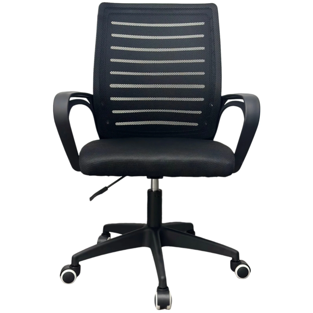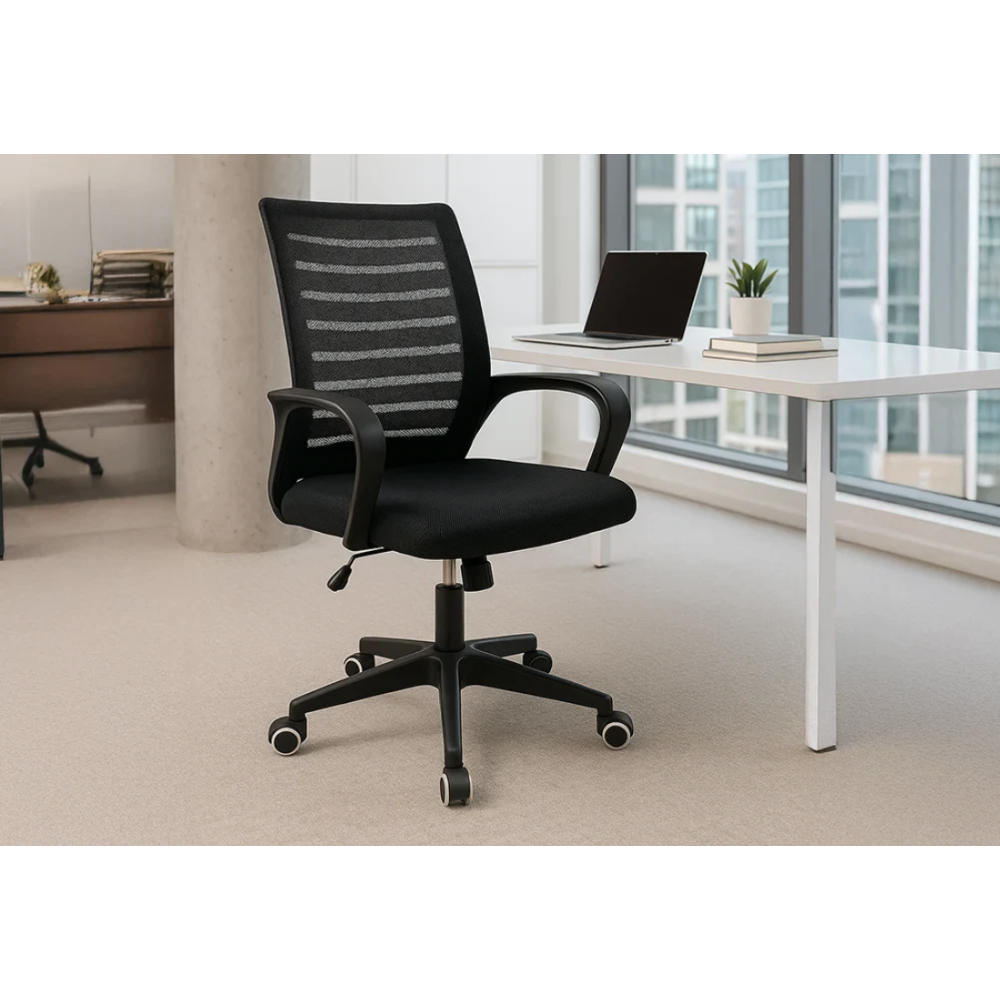 Ce fauteuil de bureau combine confort et fonctionnalité pour un usage quotidien. Son assise et son dossier en maille respirante noire assurent une bonne aération, idéale pour de longues heures de travail. Grâce à son mécanisme papillon et à sa hauteur réglable, il s’adapte facilement à votre posture. Son coussin d’assise de 8 cm offre un confort optimal. Sa structure et sa base en polypropylène 300 garantissent solidité et stabilité, tandis que les roulettes assurent une mobilité fluide. Équipé d’un vérin à gaz classe 2. Dimensions : 60 x 55 x 94 cm.
