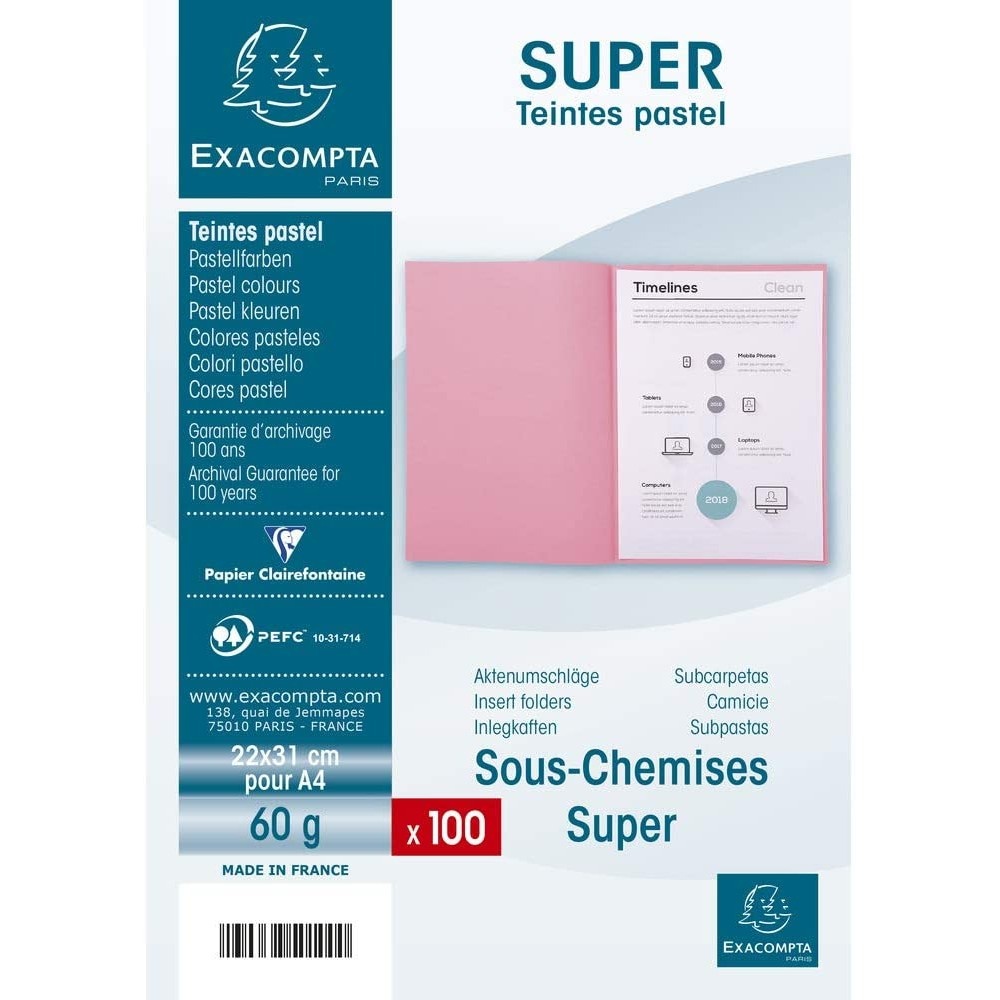 Sous-chemises SUPER  EXACOMPTA 60 Rose x 100 - A4 - 60 g - 100 pcs  - format A4 - 60 g/m2 - couleur jaune - 100% recyclé - certifié PEFC - dimensions: (L)220 x (H)310 mm - contenu: 100 pièces.