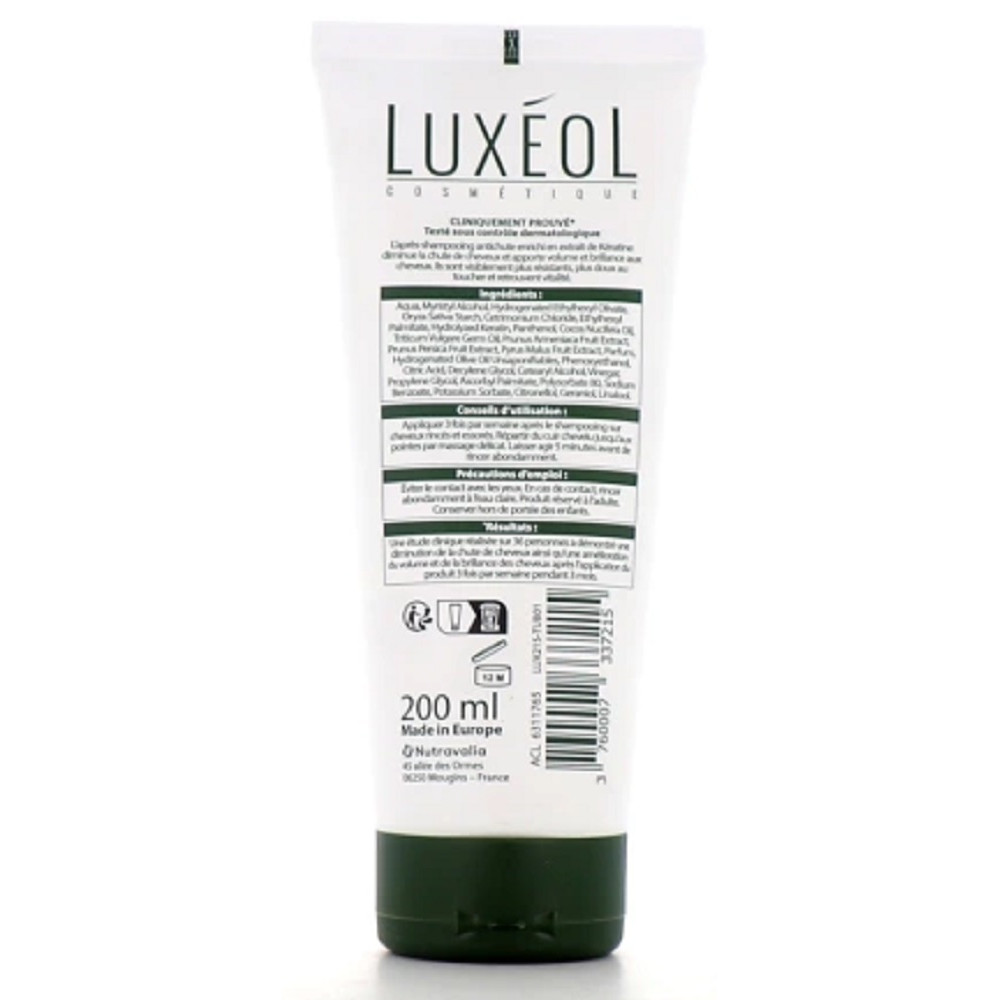 Masque antichute Luxéol pour les personnes qui souffrent d'une perte de cheveux - Permet d'atténuer la perte de cheveux de manière significative grâce à sa formule enrichie en kératine (qui réduit la perte des cheveux), d'huile de coco (qui booste la croissance des cheveux), et les extraits de feuille de thé vert (qui apportent un effet antioxydant) - Garantit une chevelure plus résistante, douce et profondément revitalisée - S'utilise après un après-shampoing et de préférence sur cheveux bien rincés et essorés pour plus d'efficacité.