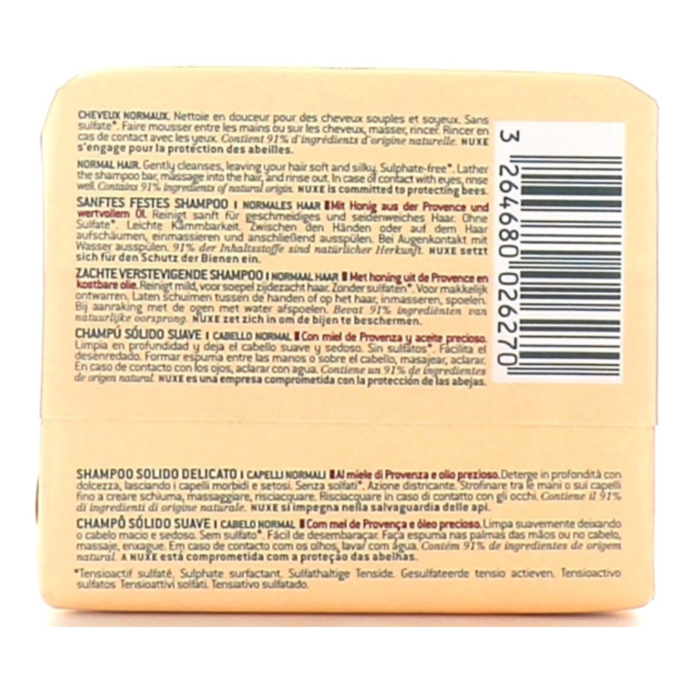 Nuxe Rêve de Miel Shampooing Solide enveloppe les cheveux de douceur grâce au miel de Provence et à l'huile précieuse de Cameline bio - Sa mousse généreuse se rince facilement et contribue à un démêlage facile - Ce shampooing sans sulfate deviendra un de vos produits chouchou - Il rendra vos cheveux souples et soyeux, tout en respectant votre cuir chevelu.