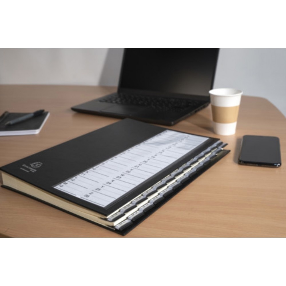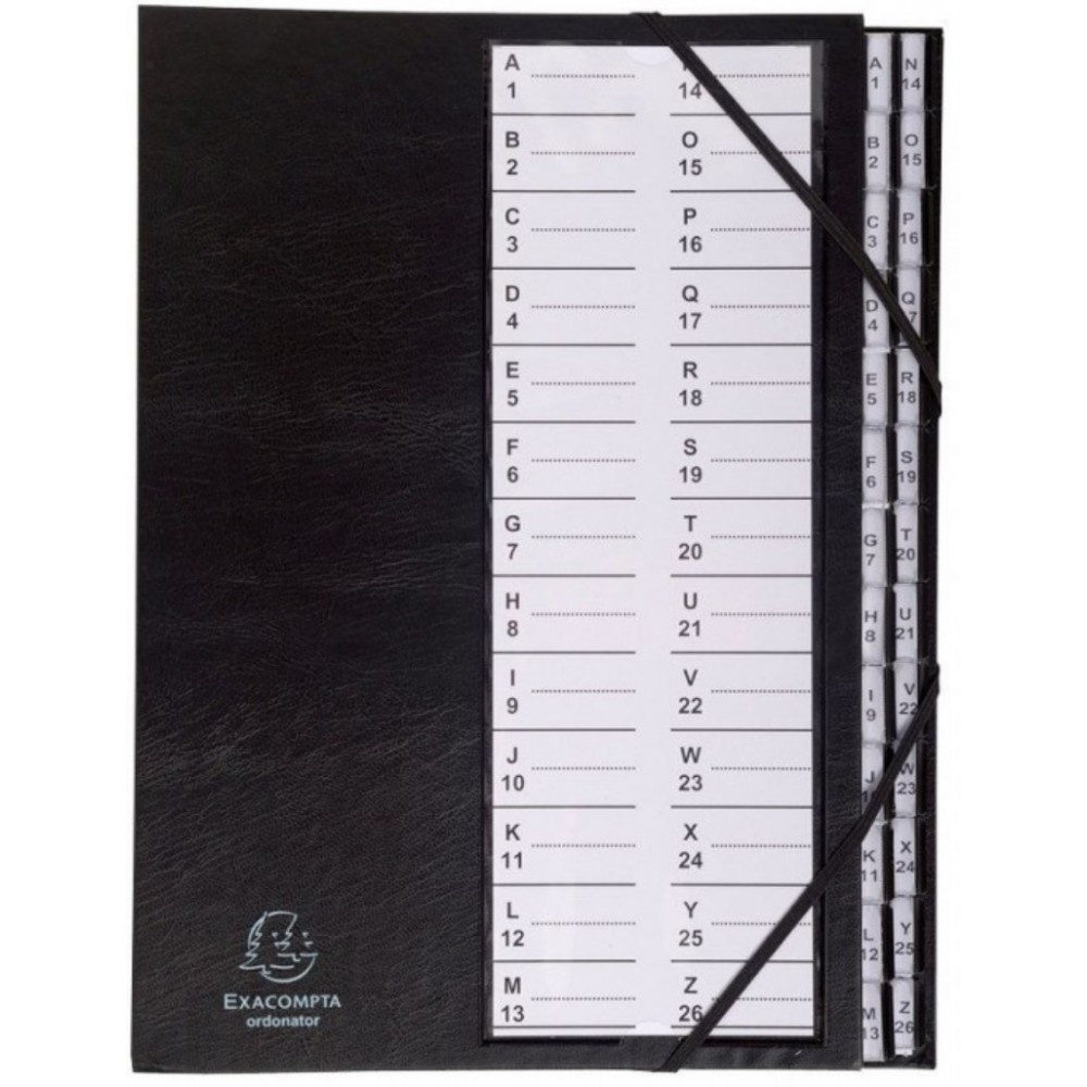 EXACOMPTA Trieur Ordonator, PP, 26 compartiments, noir dos pliant extensible à soufflet, couverture en carton avec film plastique renforcé, onglets et étiquettes préimprimées, onglets plastiques avec un effet de loupe, intérieur en carton de couleur ivoire 300 g/m2, dimensions : 250 x 330mm.