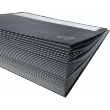 Couverture plastifiée, munie d'un porte-étiquette sur la face avant. Intérieur en carte rigide 300 g/m2 rose, perforation en 3 points des compartiments afin de déceler la présence de documents. Dos extensible à soufflets. Encoches renforcées dans la partie intérieure des pages.