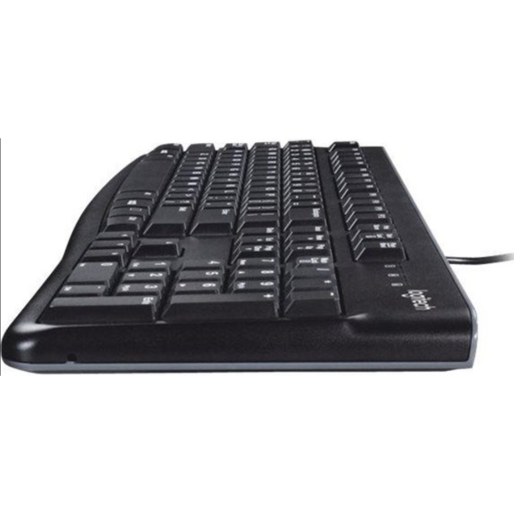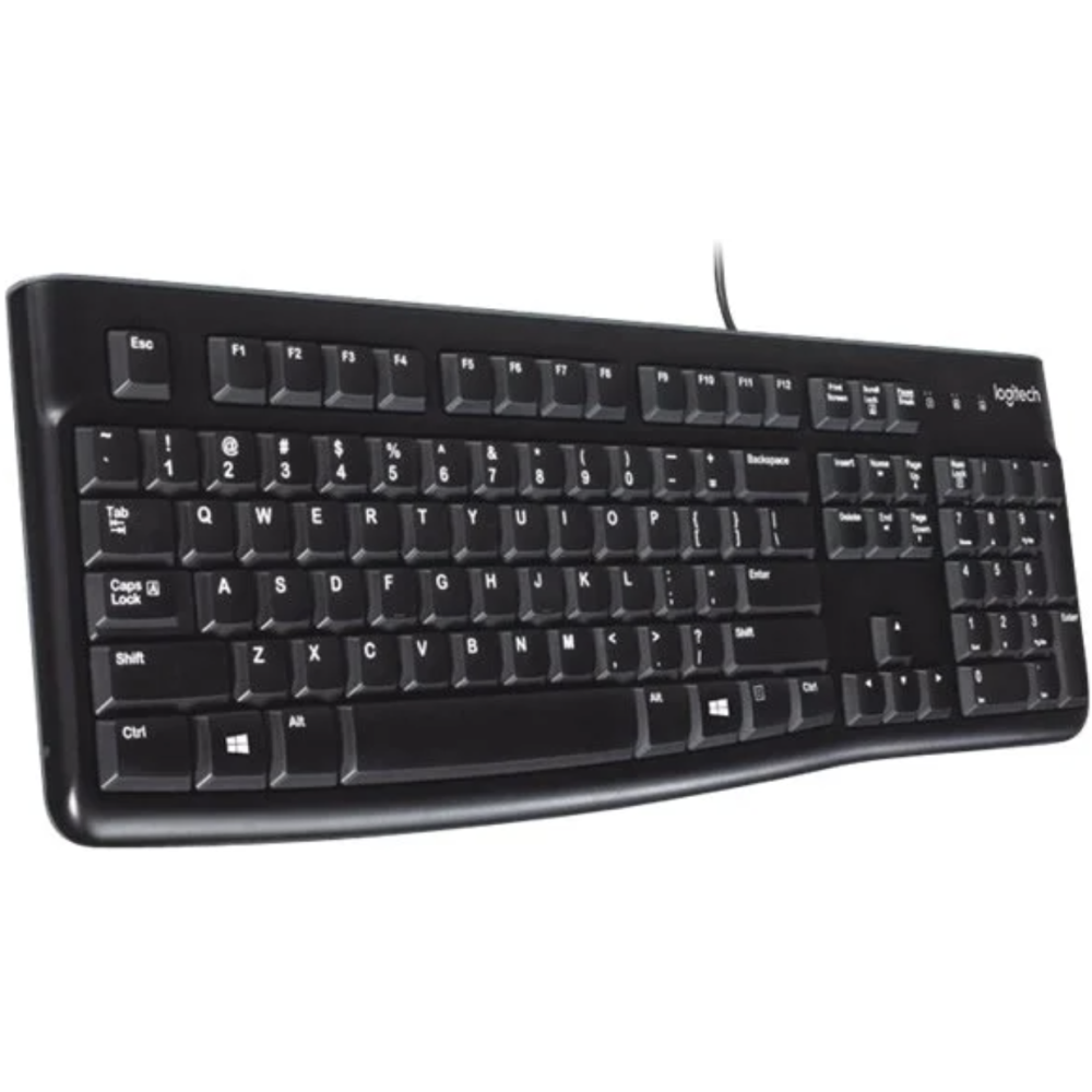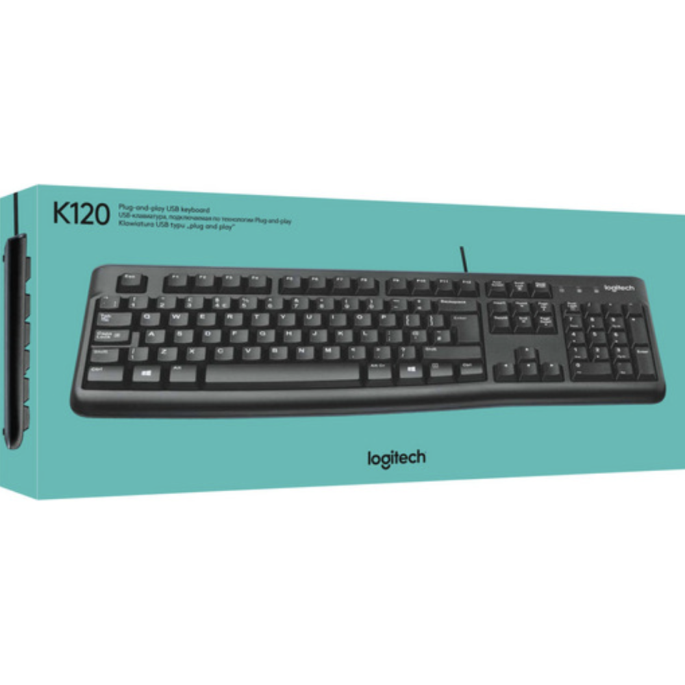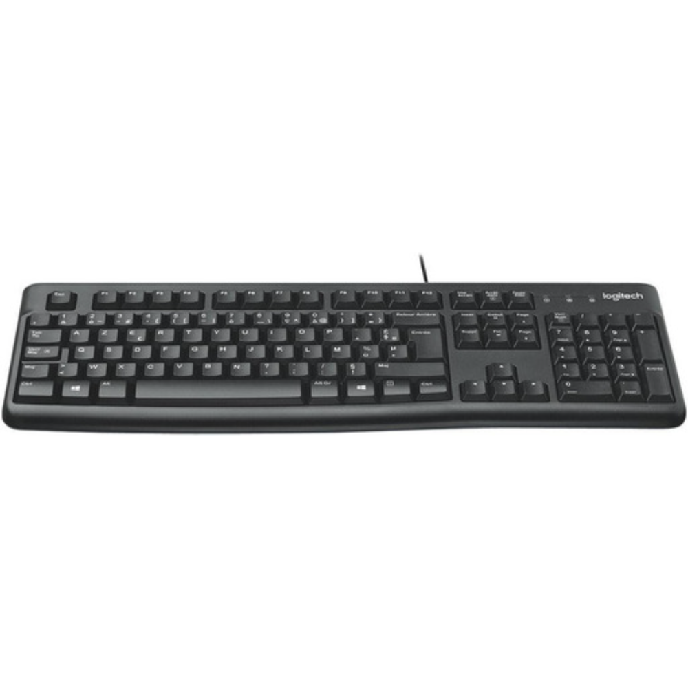 Clavier filaire Logitech K120 - Type : USB, AZERTY (FR) - Compatibilité : Windows XP / Vista / 7 (32 & 64 bits), Linux Kernel 2.6+ - Utilisation : Universelle, prêt à l'emploi (Plug and Play) - Design : Taille standard avec pavé numérique ; Résistant aux éclaboussures ; Pieds inclinables robustes ; Caractères blancs, lisibles - Confort : Frappe stable et silencieuse ; Barre d’espace courbée, touches à rebond - Dimensions : 45 x 15,5 x 2,4 cm - Poids : 550 g - Câble USB : 1,5 m inclus - Contenu de la boîte : Clavier + documentation utilisateur - EAN : 5099206020726.