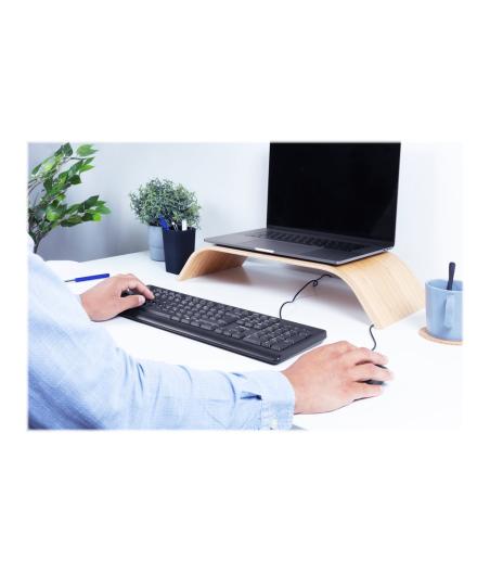 Clavier filaire Logitech K120 - Type : USB, AZERTY (FR) - Compatibilité : Windows XP / Vista / 7 (32 & 64 bits), Linux Kernel 2.6+ - Utilisation : Universelle, prêt à l'emploi (Plug and Play) - Design : Taille standard avec pavé numérique ; Résistant aux éclaboussures ; Pieds inclinables robustes ; Caractères blancs, lisibles - Confort : Frappe stable et silencieuse ; Barre d’espace courbée, touches à rebond - Dimensions : 45 x 15,5 x 2,4 cm - Poids : 550 g - Câble USB : 1,5 m inclus - Contenu de la boîte : Clavier + documentation utilisateur - EAN : 5099206020726.