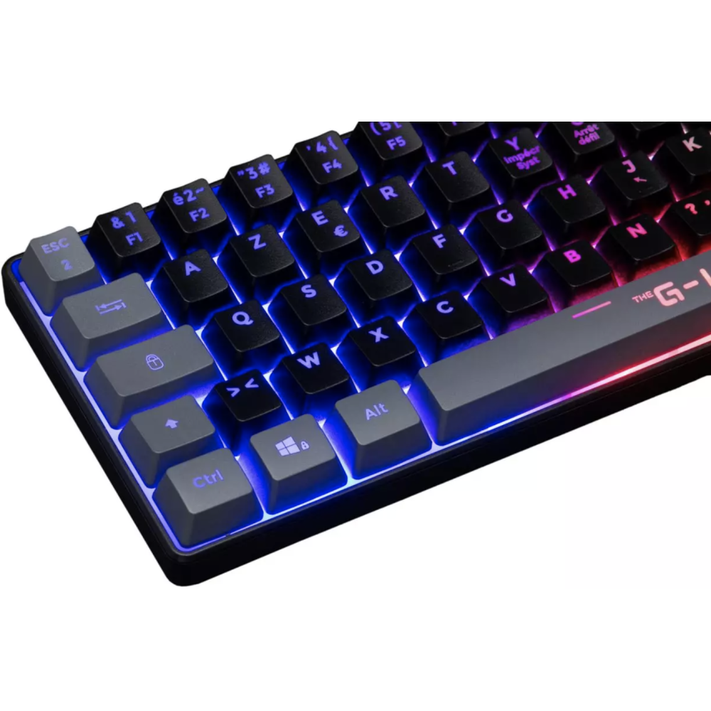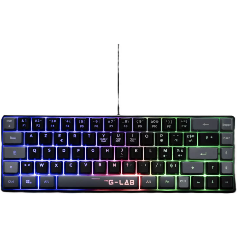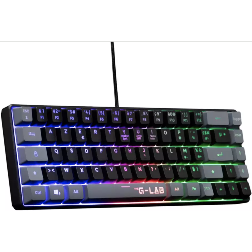 Clavier Gaming Membrane - Marque : THE G-LAB KEYZ - Utilisation : Gamer - Couleurs : Noir et gris - Connexion : Filaire - Type de clavier : Membrane - Type de touche : Membrane réactive et silencieuse - Rétroéclairage : Rainbow (rétroéclairé) - Interface avec le PC : USB - Anti-ghosting : 19 touches - Pilote de personnalisation : Non - Compatibilité : PC, PS4, XBOX - Longueur du câble : 1,5 m - Poids (avec câble) : 430 g - Durée de vie des touches : 12 millions de frappes - EAN : 3760162067682.